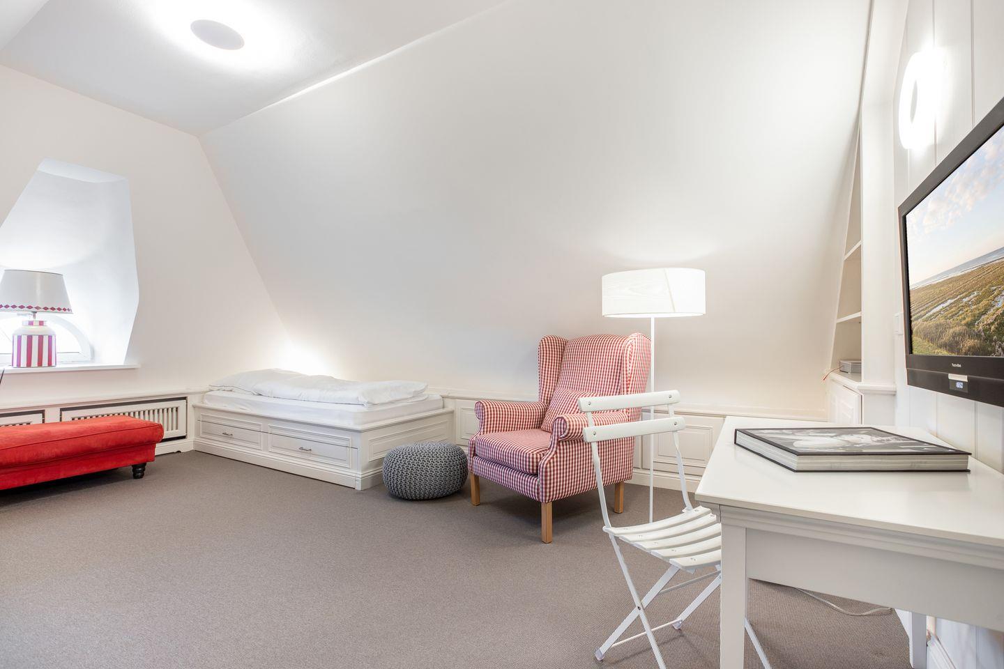 Die Ferienwohnung im Obergeschoß und ausgebautem Dachgeschoß in Südwestlage ist ca. 80 m² groß und bietet zwei bis vier Personen Geborgenheit. Das reetgedeckte Haus liegt vor dem "Süderhof" im Südwesten des Ortes auf einem rund 2000 Quadratmeter großen Grundstück, das von einem Friesenwall umgeben ist. Der Bereich im Obergeschoß ist komplett mit allergikerfreundlichem Boden versehen. Die Wohnung verfügt über modernen Komfort wie Flat-TV mit Digitalempfang, DVD und VCR, W-Lan, Stereoanlage mit CD-Spielern, Espressomaschine, Geschirrspüler, Cerankochfeld, Backofen und Mikrowelle. Im Keller des Hauses steht Ihnen gegen Gebühr eine Waschmaschine und Trockner zur Verfügung. Zur Wohnung gehört ein kleiner Platz mit einem Saison-Strandkorb (ca. April - Oktober )