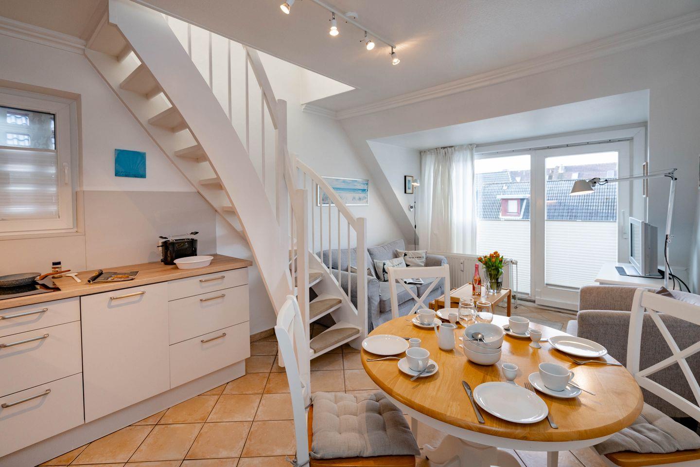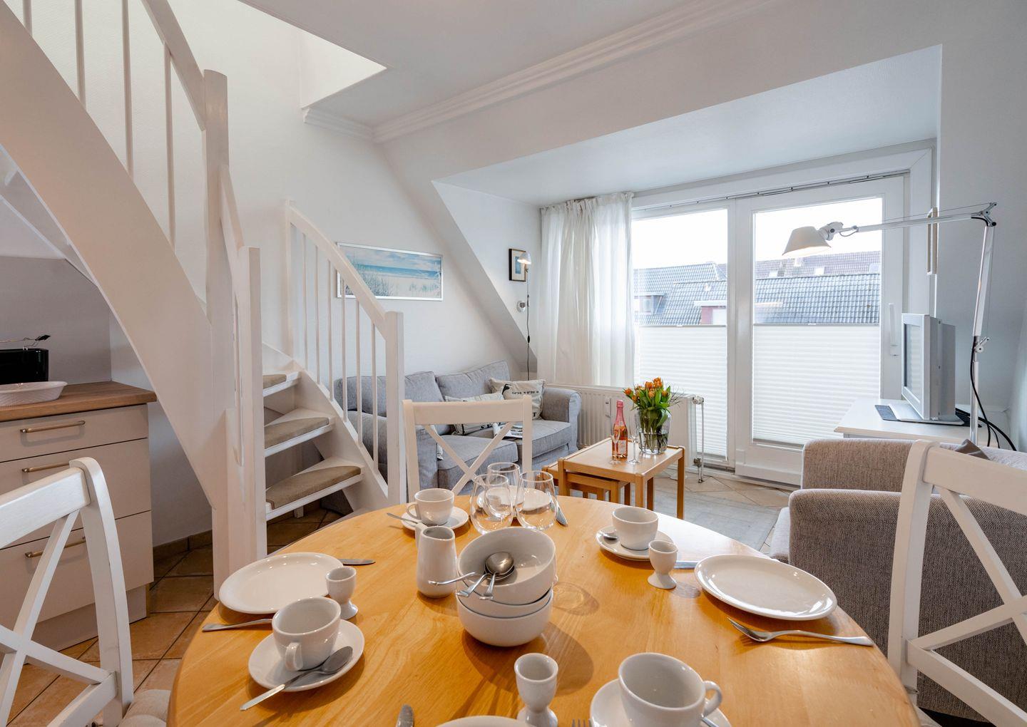Moin Moin und Willkommen in der 3-Zimmer-Ferienwohnung "Dorothea". Sie liegt im ersten Stock einer kleinen Wenningstedter Wohnanlage über zwei Ebenen und ist circa 65 Quadratmeter groß. Von hier aus sind es tatsächlich nur gute 250 Meter bis zum Strand, aber "Dorothea" hat auch noch einen Balkon mit Südausrichtung was wunderbare Momente voller Mittagssonne bescheren kann.