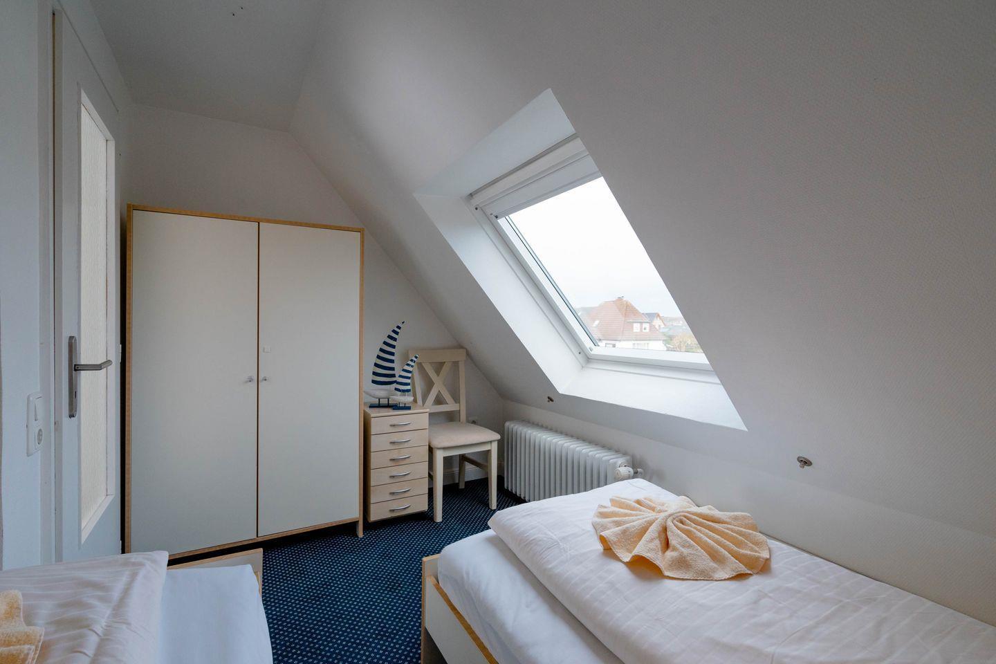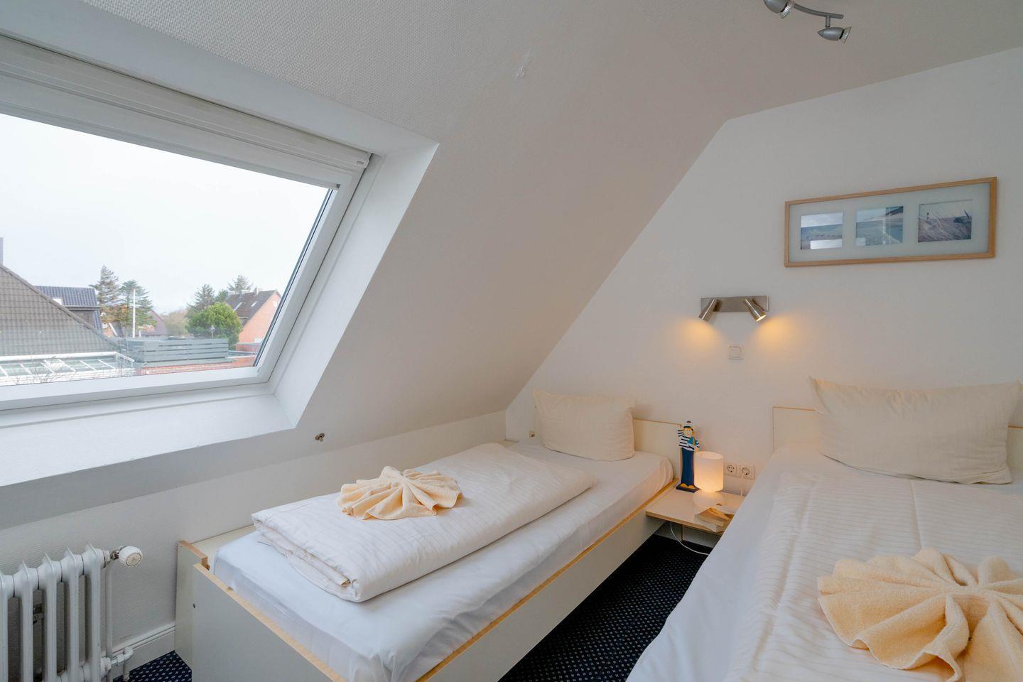 Moin und herzlich Willkommen im Ferienhausteil „Stranddiestel“, zentral und doch ruhig gelegen im familienfreundlichen Wenningstedt. Bäcker Jessen, Feinkost Meyer, Gosch am Kliff und natürlich der Strand - alles ist von hier aus in wenigen Minuten zu Fuß zu erreichen. Die gemütliche Wohnung, genaugenommen ist es ein reelles Hausdrittel, erstreckt sich über zwei Ebenen und passt perfekt für vier Personen: Sie bietet zwei Schlafzimmer, mit einem Doppel- und zwei Einzelbetten sowie zwei Duschbäder.