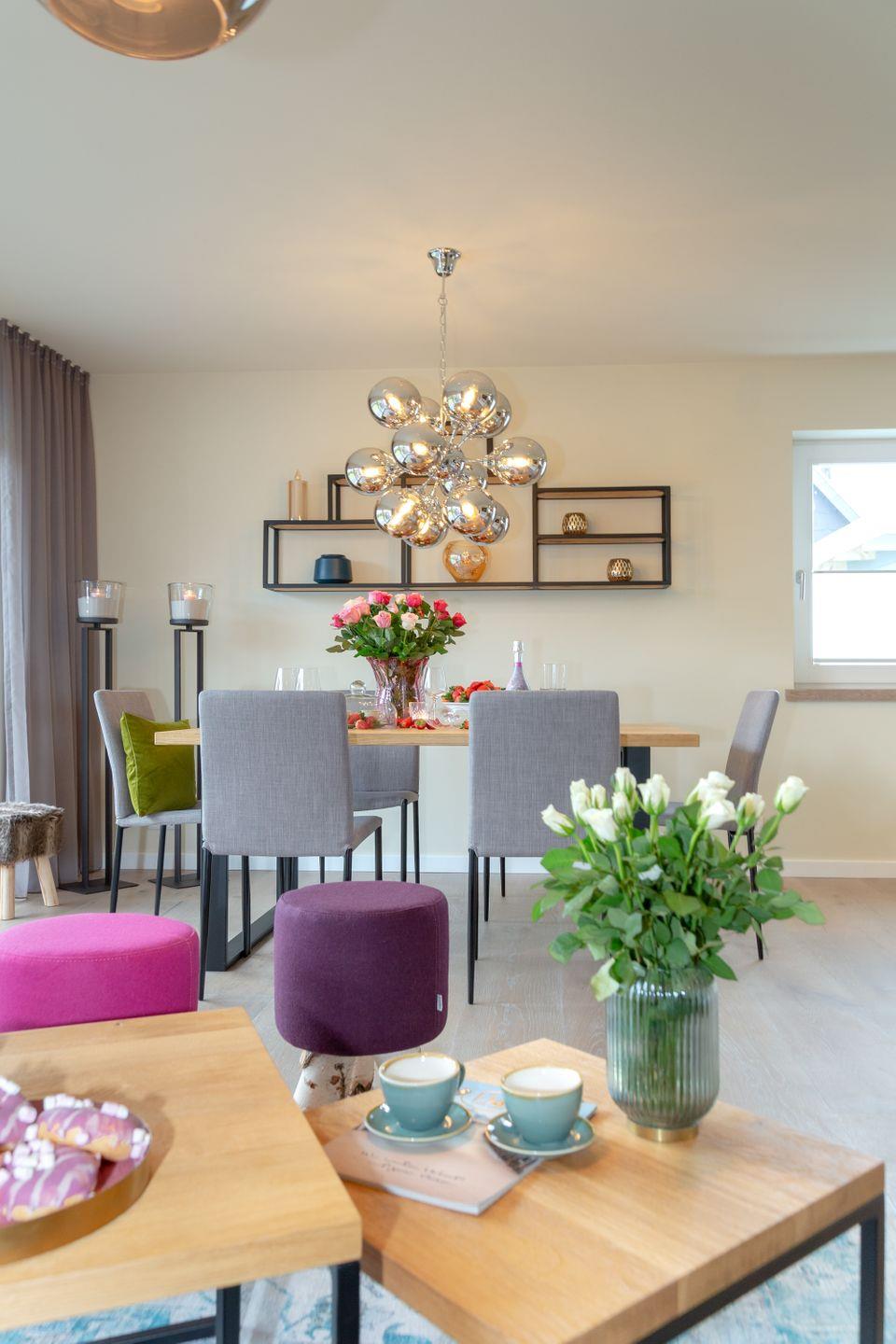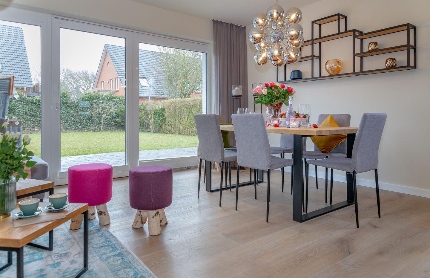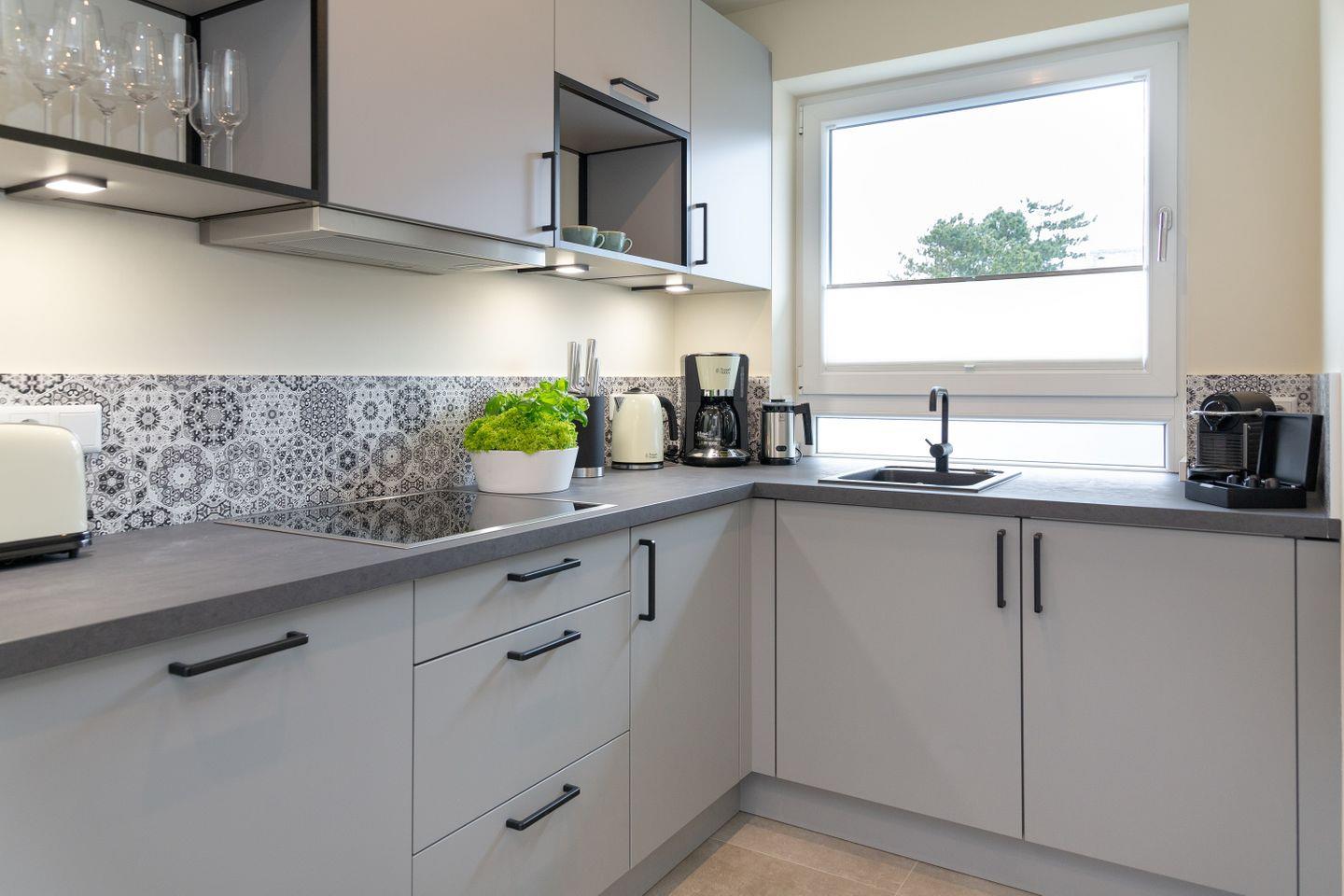 Das helle Wohnzimmer, ausgestattet mit komfortablen Polstermöbeln und edlen Holzfußböden, lädt zum Entspannen ein. Die offene Küche mit angrenzendem Essbereich bietet den perfekten Rahmen für gesellige Stunden mit Freunden und Familie. Dank der hochwertigen Ausstattung können Sie sich hier auch im Urlaub ganz nach Ihren Wünschen selbst versorgen und verwöhnen.