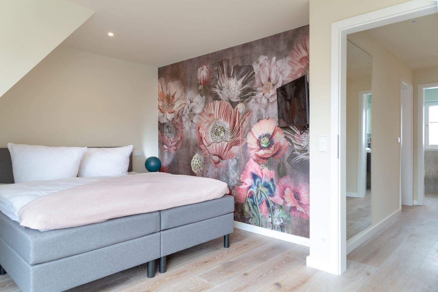 Vom Wohnzimmer aus gelangen Sie auf die großzügige Terrasse und in den Garten, wo Sie in privater Atmosphäre sonnige Stunden genießen können. Ihre Nachtruhe verbringen Sie in zwei gemütlichen Schlafzimmern, eines davon mit Balkon, auf dem Sie Ihren Kaffee am Morgen genießen können. Die Boxspringbetten sorgen für erholsamen Schlaf, während ausreichend Stauraum für Ihre Urlaubsgarderobe vorhanden ist.