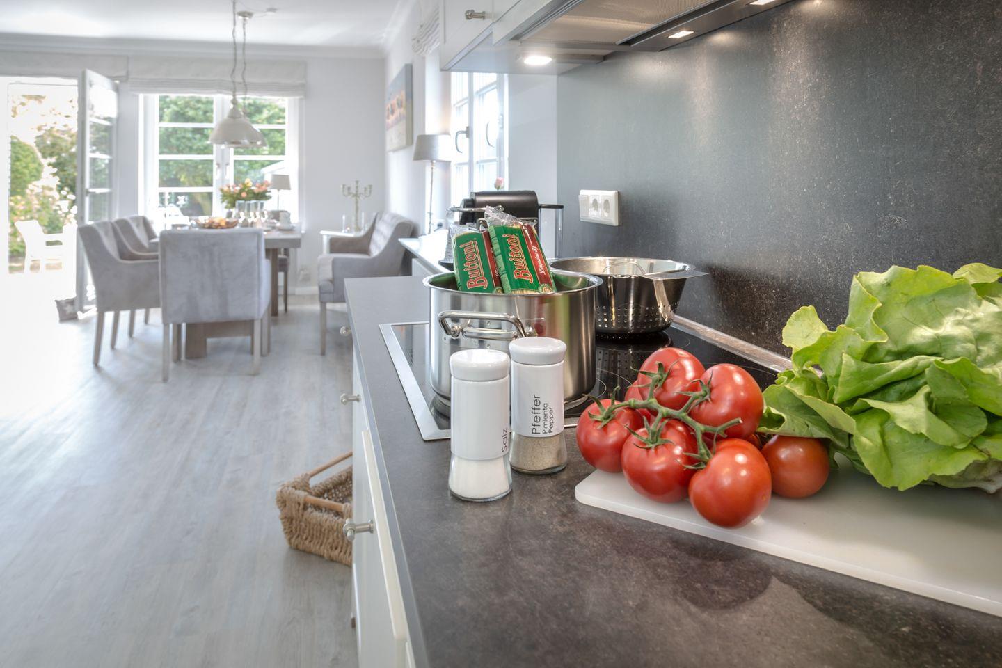 Der großzügige Wohn- und Essbereich lädt mit seiner komfortablen Sofaecke und dem gemütlichen Esstisch zu geselligen Abenden und entspannenden Stunden ein. Die offen gestaltete Küche ist hochwertig ausgestattet und bietet alle Annehmlichkeiten für eine stressfreie Selbstversorgung, inklusive Filterkaffeemaschine.