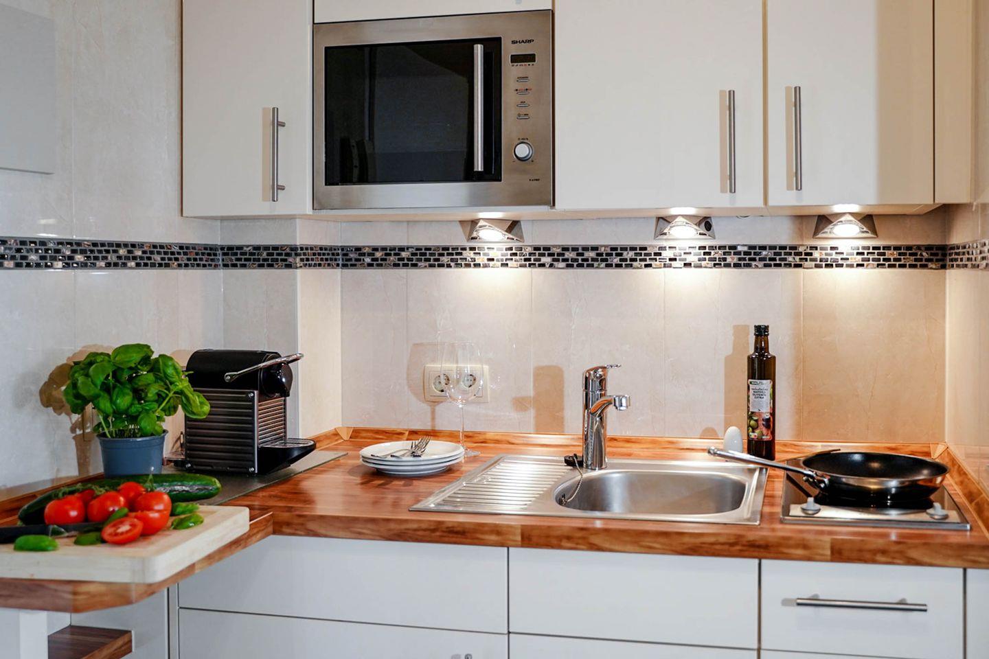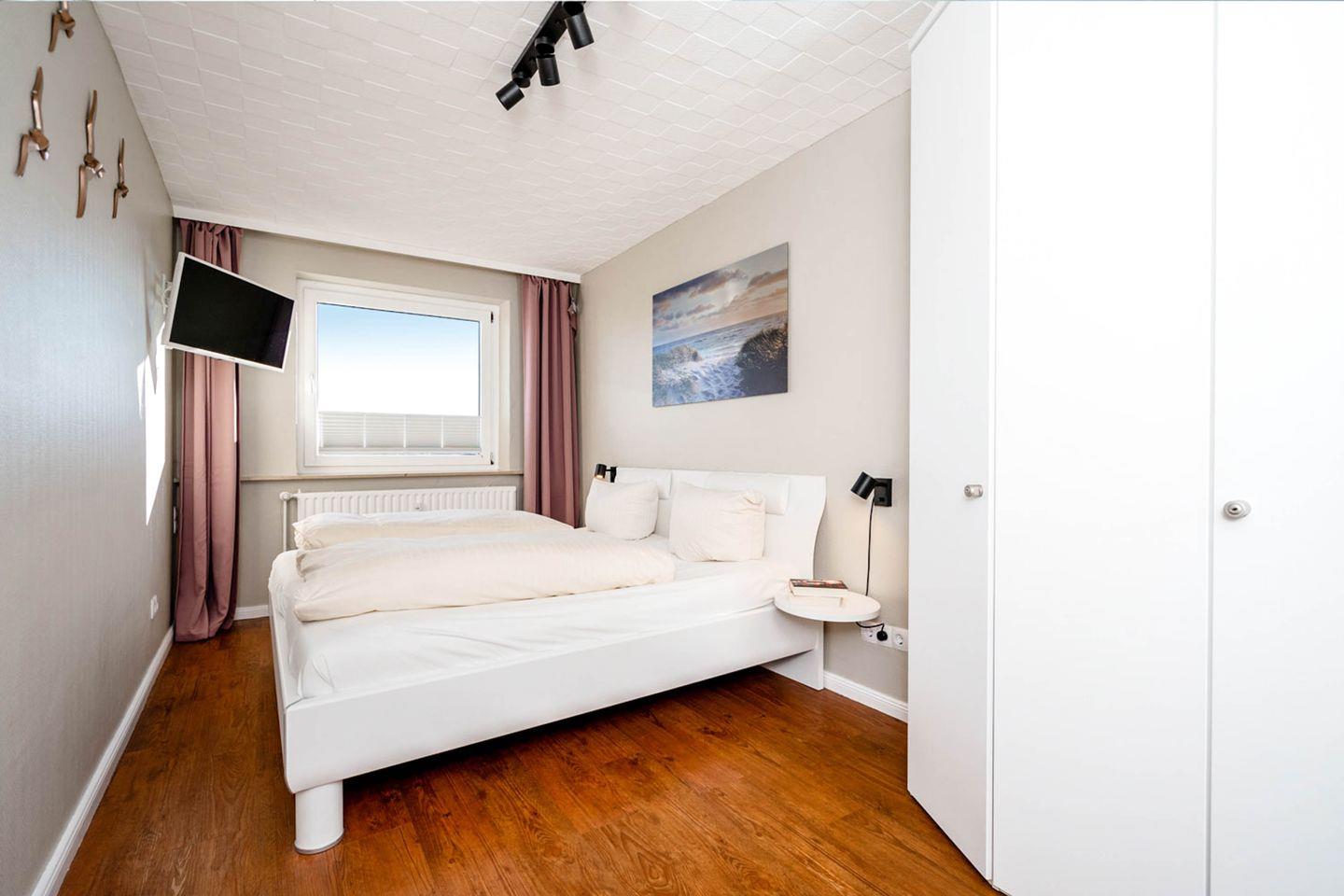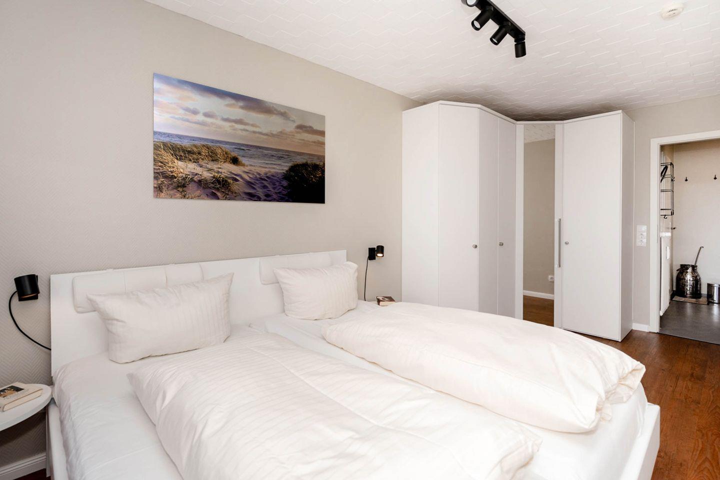 Moin moin und herzlich Willkommen im Ferienappartement "Eidum Strand", also quasi der Insel auf Ihrer Insel. Diese 2-Zimmer-Wohnung liegt im zweiten Stock eines Appartementhauses im Zentrum von Westerland und nur einen Katzensprung vom Strand entfernt. Sie hat nicht nur einen sonnigen, nett möblierten Balkon mit Blickrichtung Richtung Süden, sondern auch noch einen eigenen Außenparkplatz, was beides in der City ein bemerkenswertes Plus ausmacht. Wlan ist hier übrigens genauso selbstverständlich wie ein "echtes" Doppelbett mit 1,80 Metern Breite und – manche lieben es als Einschlafhilfe oder für den morgendlichen Nachrichtenüberblick – ein zusätzliches Fernsehgerät im Schlafzimmer. Kurz: Das Eidum Strand ist perfekt für Zwei, die kurze Wege, unkomplizierten Komfort und das Herz der Insel lieben.
