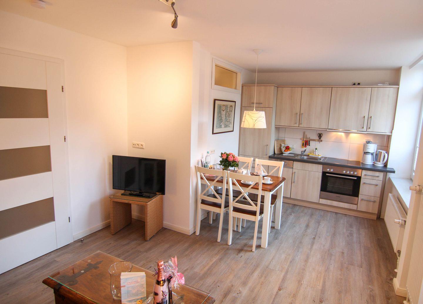 Moin, moin und herzlich Willkommen bei "Lukas" im Bockelmann`s Hof. Diese gleichnamige 2-Zimmer-Ferienwohnung für Zwei liegt ebenerdig und sehr zentral mitten in Westerland. Sie hat eine attraktive offene Küche mit allem drin und dran, was man so braucht, auch, wenn man länger als ein Wochenende bleibt, und ein separates Schlafzimmer mit echtem Doppelbett. Sie wurde vor Kurzem ansprechend renoviert, mit einem schönen lichten Duschbad ganz in Weiß und hat sogar eine eigene Westterrasse mit Gartenmöbeln, die auch noch eingezäunt ist. Perfekt also für alle, die mit Kleinkindern oder unternehmungslustigen Hunden anreisen! Die Wohnung nimmt alle Vorteile mit, die diese Lage bietet (kurze Wege überall hin: zum Einkauf, zum Strand, zum Bus, zur Bahn, zu Restaurants, Fußgängerzonen und Kneipen) in der Nähe des Bahnhofs und ist doch relativ abgeschieden. Sie liegt, wie der Sylter so sagt, "hinten rum", also quasi im Innenhof versteckt.