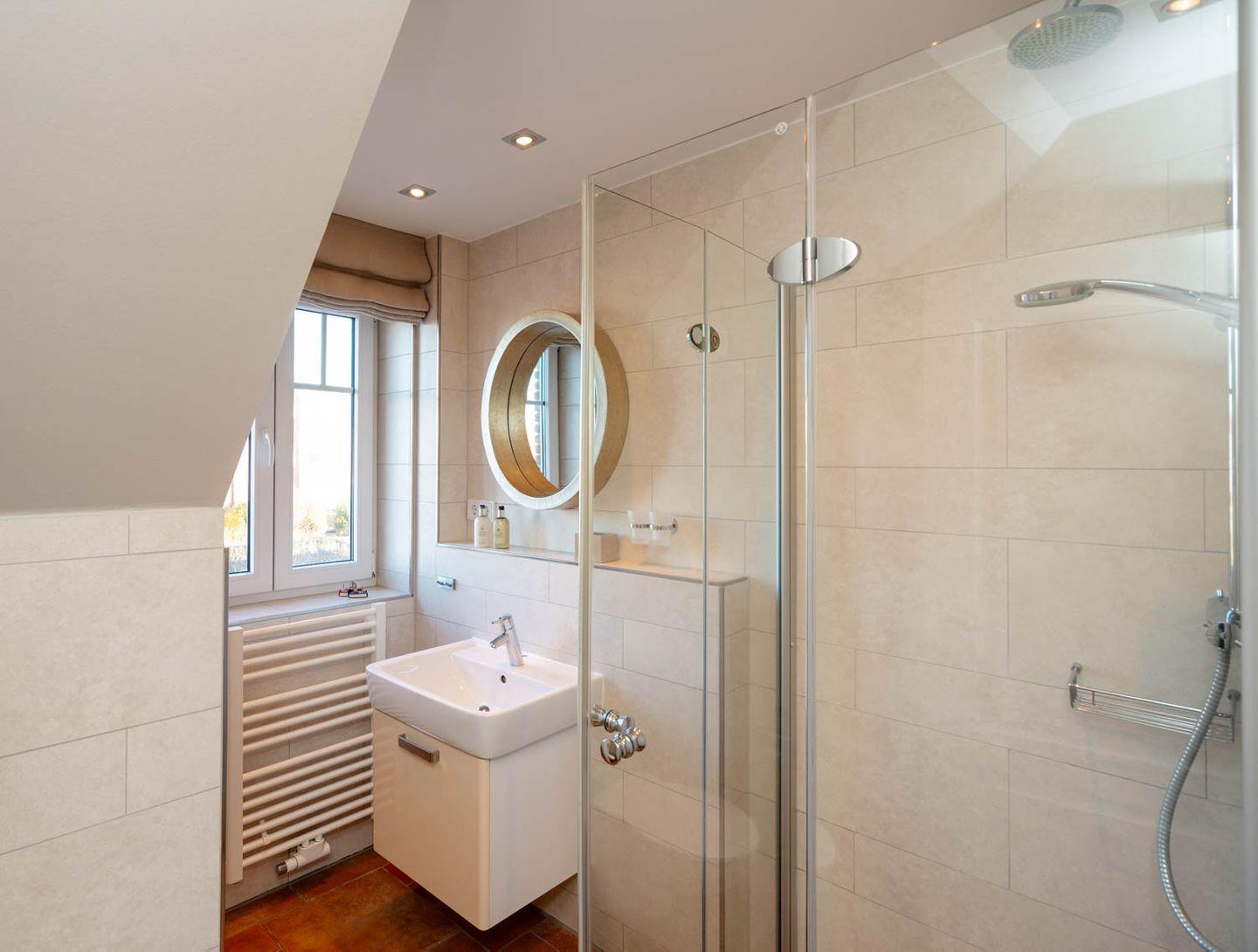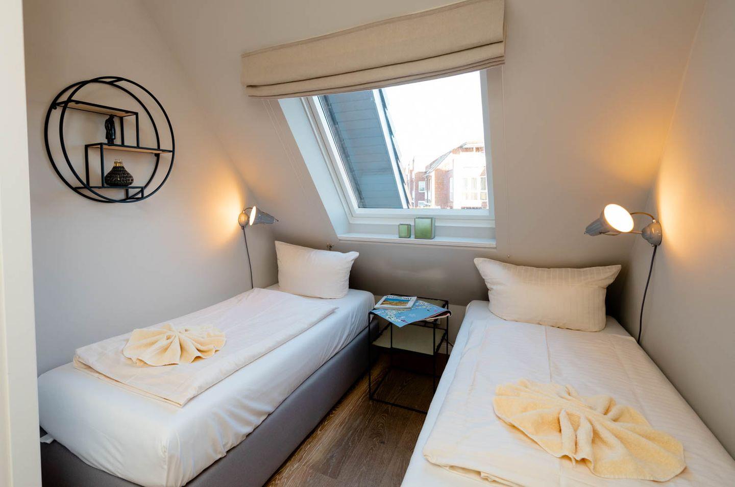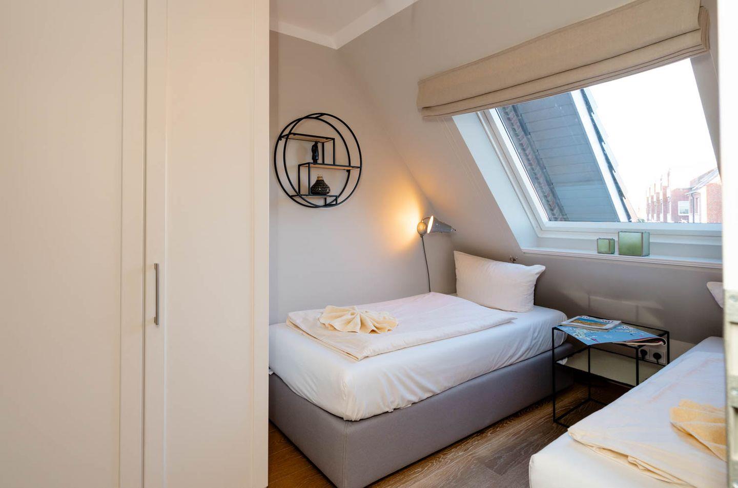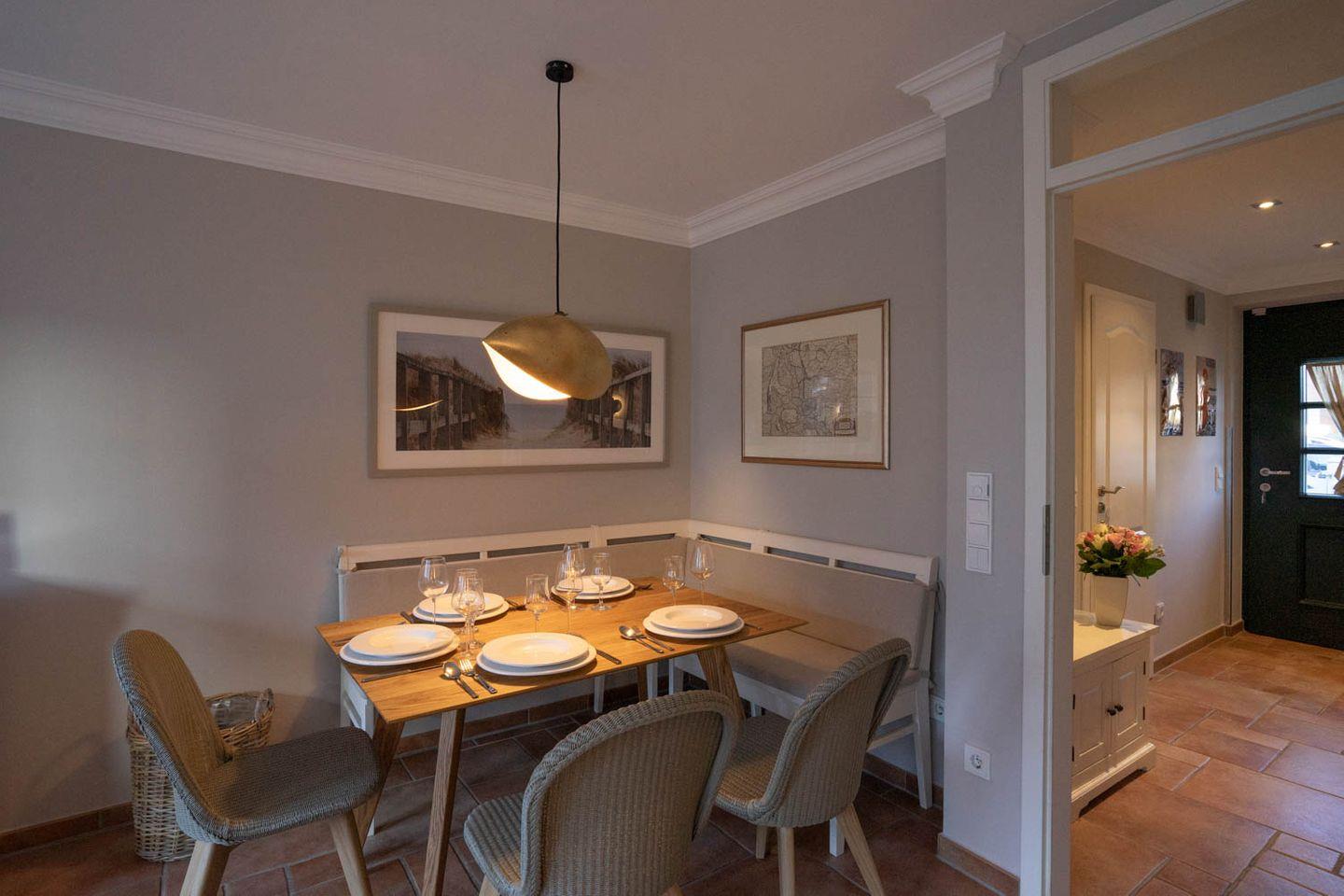 Moin und herzlich willkommen, sagt Ekke 1, diese 100 Quadratmeter große 4-Zimmer-Ferienwohnung, die sich über Erd-, Ober- und Dachgeschoss erstreckt, in einer kleinen Ferienwohnanlage im ruhigeren nördlichen Teil von Westerland liegt. Ein Gartenanteil und eine eigene Terrasse mit Möbeln und Strandkorb gehören dazu, ein hauseigener Parkplatz und ein Minibalkon im Obergeschoss, der tatsächlich Meerblick hat. Und auch die inneren Werte von „Ekke 1“ können sich sehen lassen mit zwei Bädern, eines davon inklusive Waschmaschine/Trockner, und drei Schlafzimmern mit zwei Doppel- und zwei Einzelbetten sowie einem Kinderbett. Das im Landhausstil eingerichtete Wohnzimmer hat sogar einen der typischen nordischen Kaminöfen und eine Fußbodenheizung, die Einrichtung ist sommerlich licht und freundlich. Dass die edle Küche mit Mikrowelle, Cerankochfeld, Cappuccino-Maschine und Backofen voll ausgestattet ist, passt zum perfekten Stil des Hauses. Die Lage der Wohnung ist ruhig und trotzdem strandnah, zu Fuß braucht man von hier aus nur gute fünf Minuten bis an den Strand, bis zur Innenstadt sind‘s höchstens zehn, ein Bäcker findet sich ganz in der Nähe.