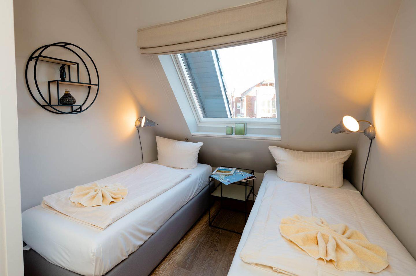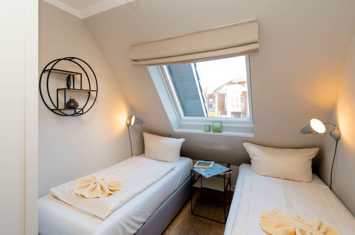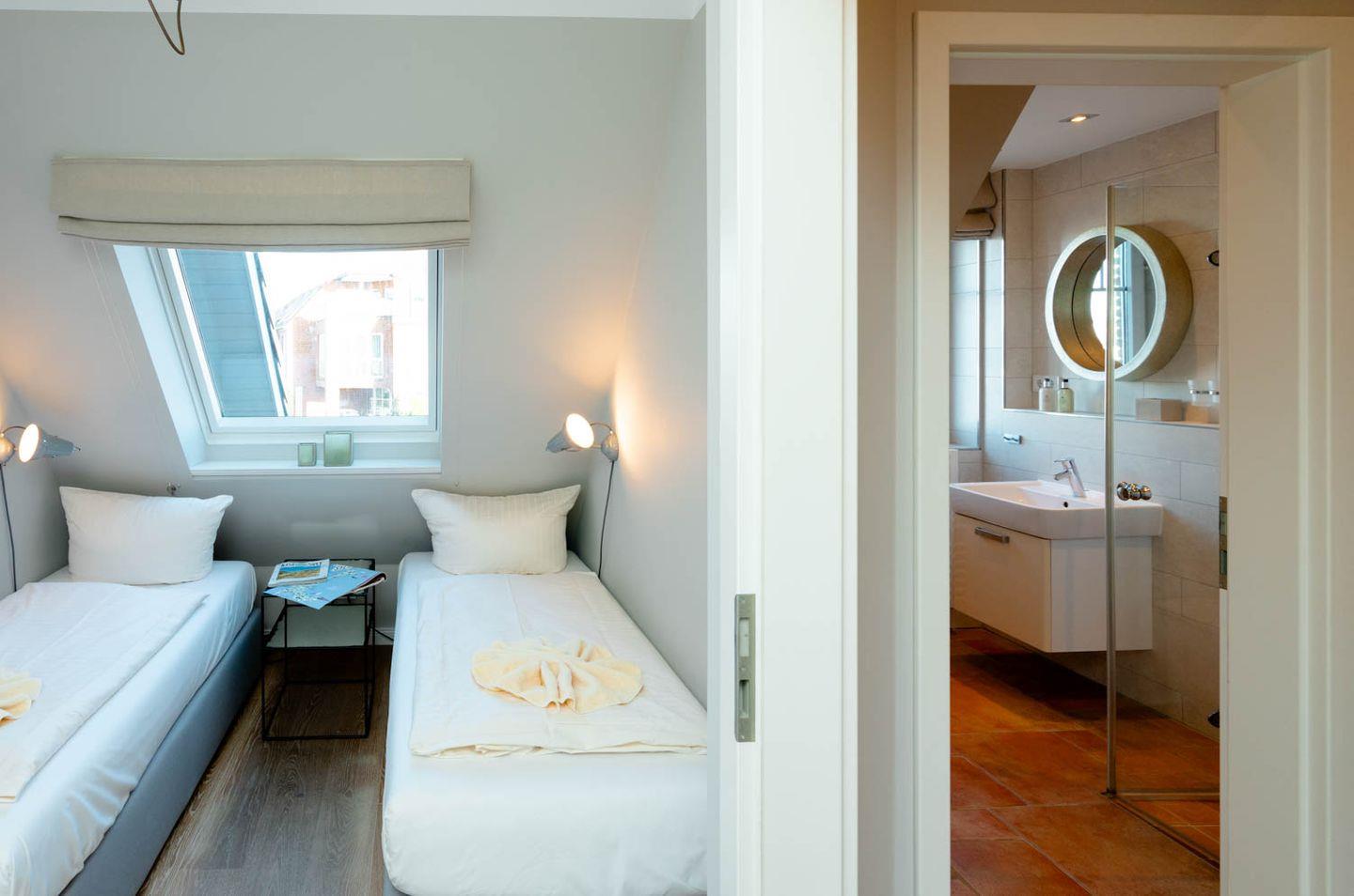 Moin und herzlich willkommen, sagt Ekke 1, diese 100 Quadratmeter große 4-Zimmer-Ferienwohnung, die sich über Erd-, Ober- und Dachgeschoss erstreckt, in einer kleinen Ferienwohnanlage im ruhigeren nördlichen Teil von Westerland liegt. Ein Gartenanteil und eine eigene Terrasse mit Möbeln und Strandkorb gehören dazu, ein hauseigener Parkplatz und ein Minibalkon im Obergeschoss, der tatsächlich Meerblick hat. Und auch die inneren Werte von „Ekke 1“ können sich sehen lassen mit zwei Bädern, eines davon inklusive Waschmaschine/Trockner, und drei Schlafzimmern mit zwei Doppel- und zwei Einzelbetten sowie einem Kinderbett. Das im Landhausstil eingerichtete Wohnzimmer hat sogar einen der typischen nordischen Kaminöfen und eine Fußbodenheizung, die Einrichtung ist sommerlich licht und freundlich. Dass die edle Küche mit Mikrowelle, Cerankochfeld, Cappuccino-Maschine und Backofen voll ausgestattet ist, passt zum perfekten Stil des Hauses. Die Lage der Wohnung ist ruhig und trotzdem strandnah, zu Fuß braucht man von hier aus nur gute fünf Minuten bis an den Strand, bis zur Innenstadt sind‘s höchstens zehn, ein Bäcker findet sich ganz in der Nähe.