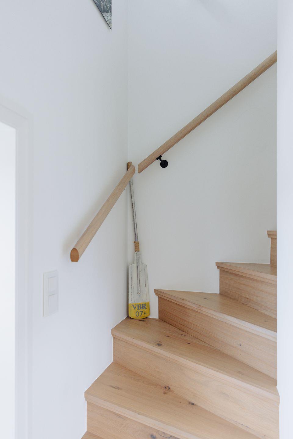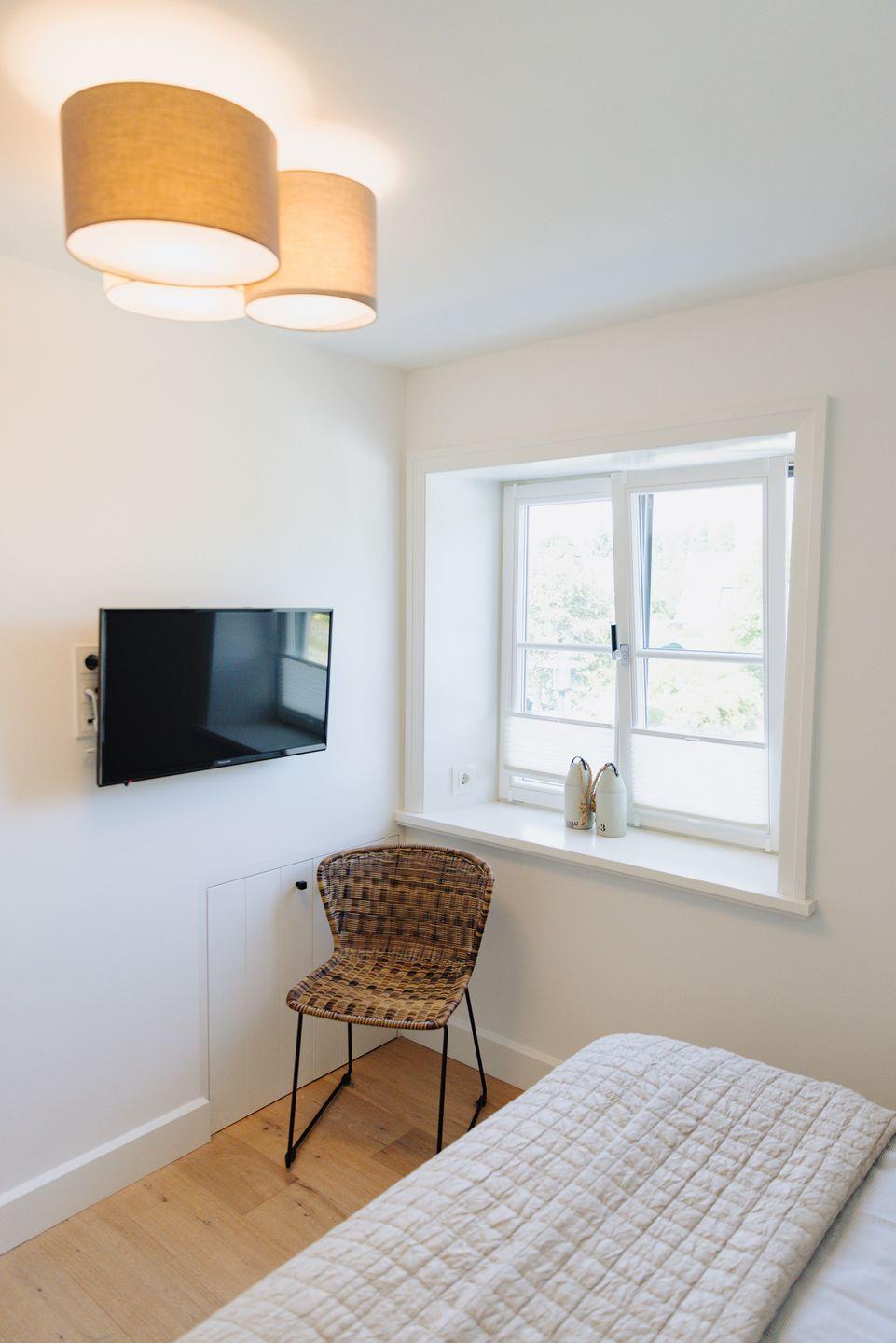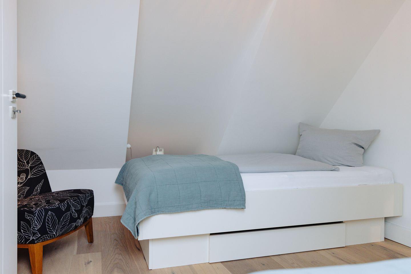 Im ersten Stock befindet sich ein geschmackvoll gestaltetes Schlafzimmer, ausgestattet mit einem komfortablen Boxspringbett.