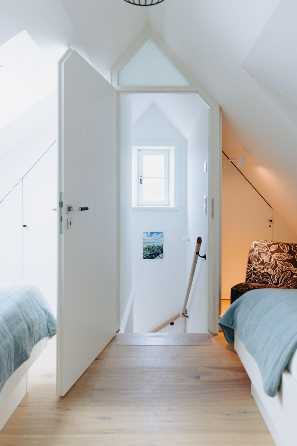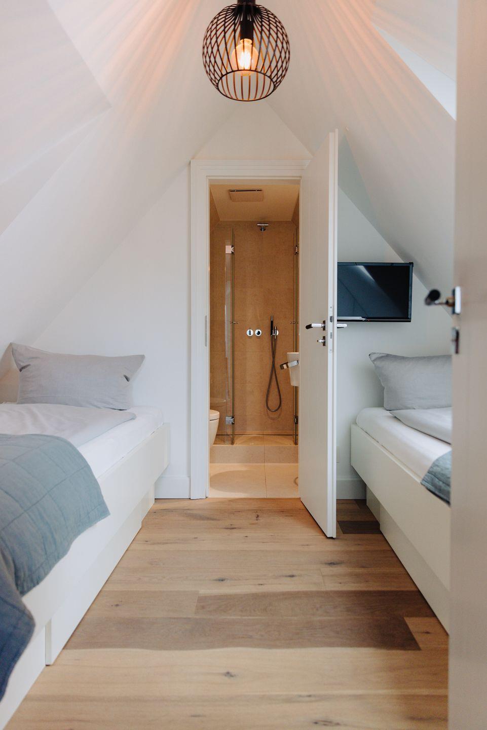 Im Obergeschoss erwartet Sie ein weiteres entzückendes Schlafzimmer, ausgestattet mit zwei Einzelbetten – ideal für Familien oder Freunde, die gemeinsam reisen. Ein angrenzendes Badezimmer sorgt für zusätzlichen Komfort und Privatsphäre.