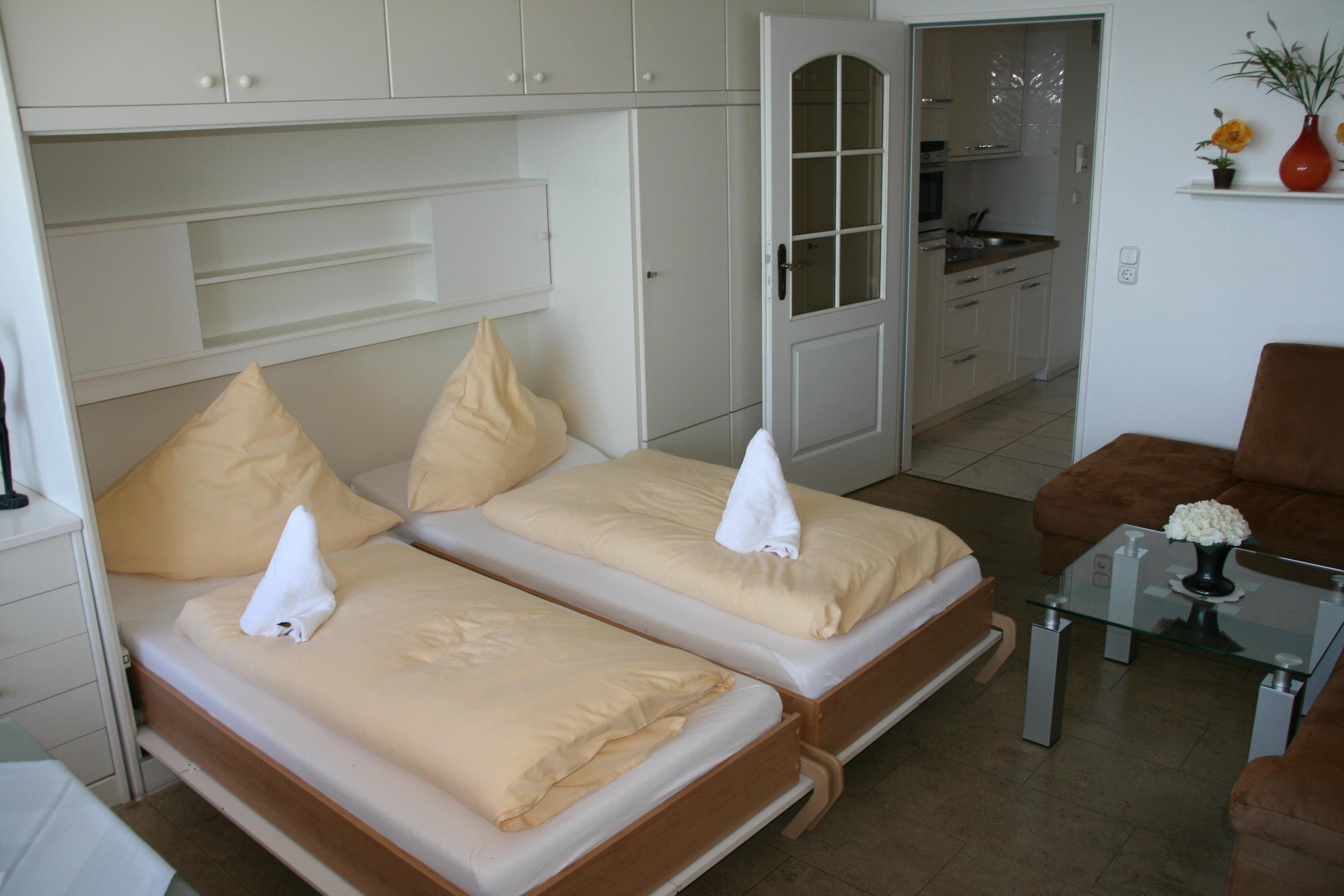 Vorflur mit moderner Küchenzeile mit Geschirrspüler, modernes Duschbad/WC, heller modern eingerichteter Wohn-/Schlafraum mit zwei Einzelschrankbetten, Sitzgarnitur, Essplatz am Fenster, Flachbildfernseher, CD-Player/Radio, hauseigenes freies WLAN. Ein Balkon rundet dieses schöne und ca. 34 m² große Appartement ab. Tiere sind im Appartement nicht gestattet. KEIN Teppichboden. Ein Außenabstellplatz kann extra hinzugemietet werden. Stellplatz muss bestellt werden, ansonsten verfällt der Anspruch!