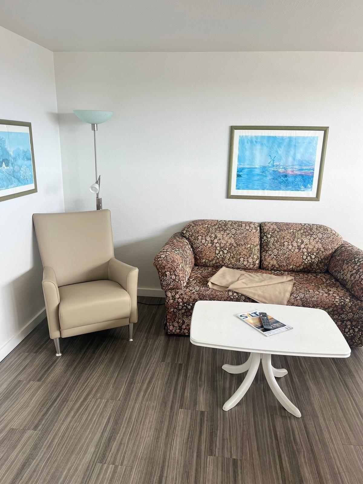 heller Wohn-/Schlafraum mit zwei Einzelschrankbetten, Sitzgarnitur bestehend aus einem Sofa und Sessel, Flachbildfernseher, Radio. Hauseigenes freies WLAN.