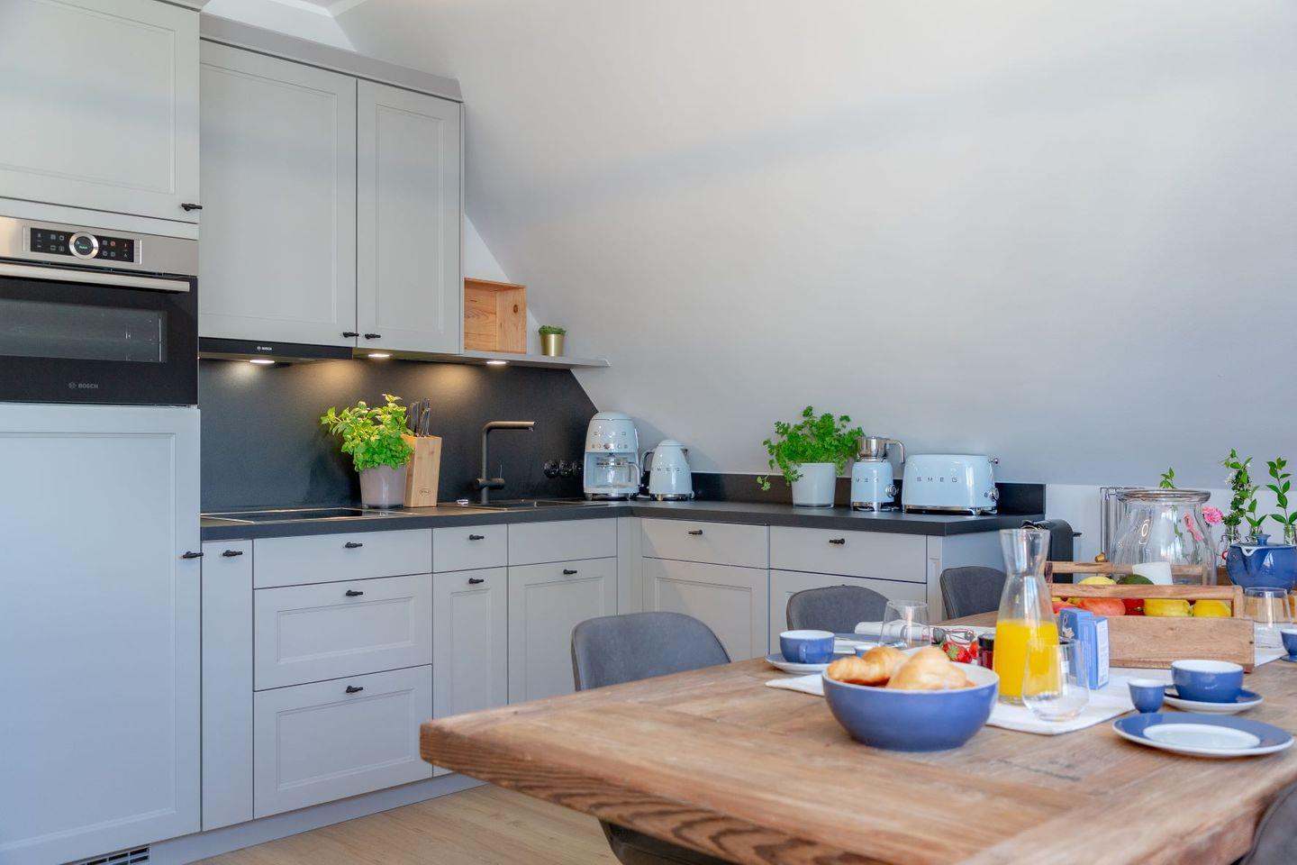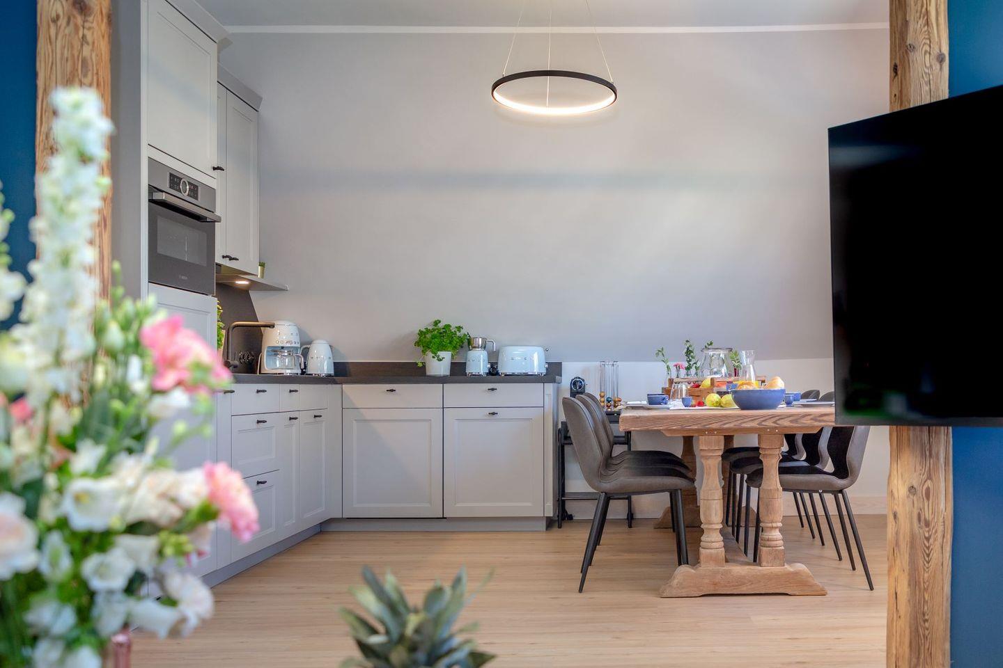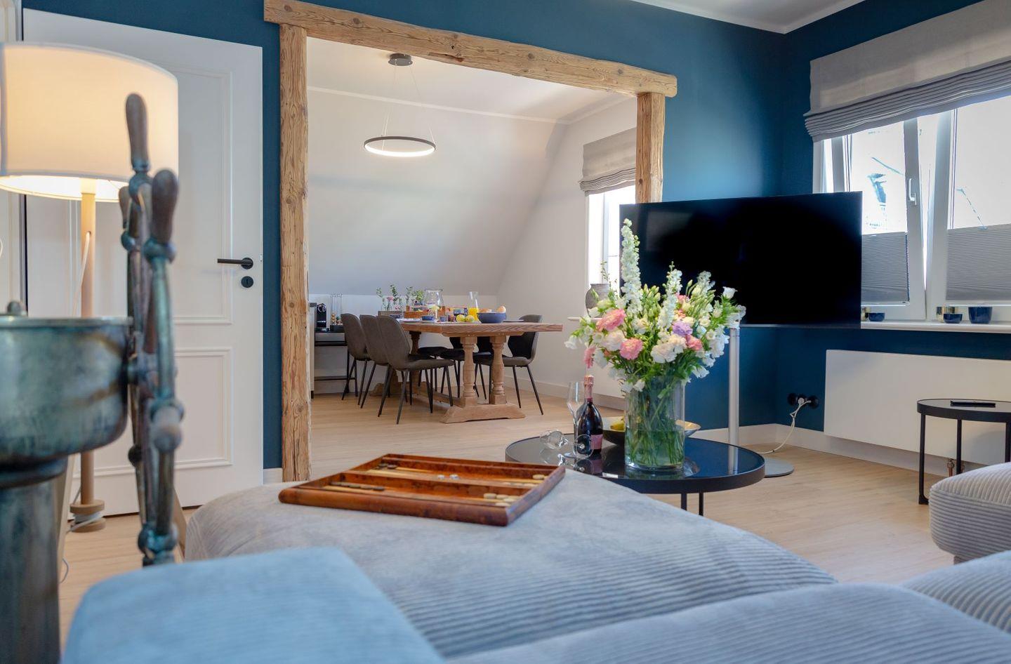 Bei der Einrichtung von Backbord wurde besonderen Wert auf geschmackvolles und bequemes Mobiliar gelegt, jedes Schlafzimmer hat ein großes Boxspringbett und im Wohnzimmer kann die ganze Familie auf der Sofalandschaft entspannen. Die Küche ist mit Backofen, Spülmaschine, unterschiedlichen Kaffeemaschinen und vor allem dem wunderschönen, großen französischen Eichentisch so eingerichtet, dass man bequem kochen, essen, spielen und klönen kann.