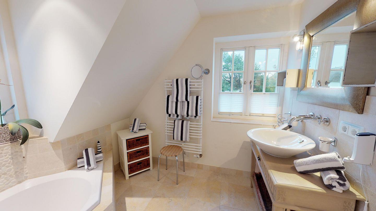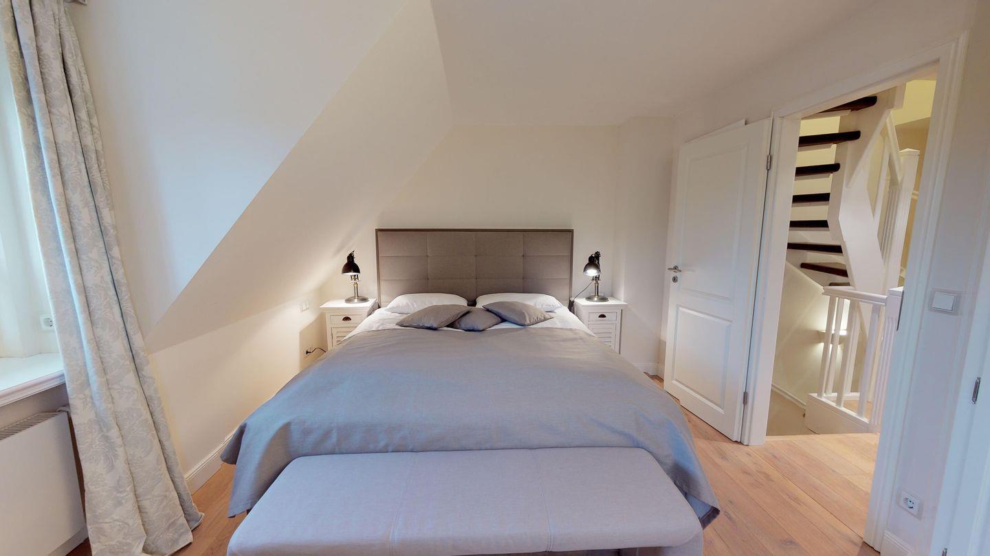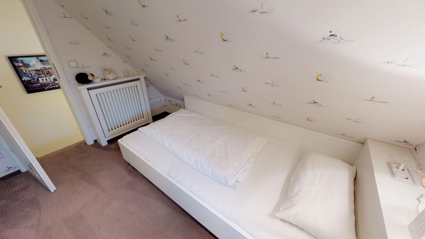 Das Dachgeschoss bietet einen weiteren gemütlichen Doppelschlafraum mit zwei Einzelbetten, ideal für Familien mit Kindern oder Freunde, die zusammen reisen.