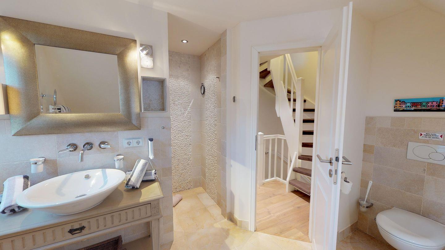 Im Erdgeschoss erwartet Sie ein gemütlicher Wohnraum, der zum Entspannen einlädt, sowie eine voll ausgestattete Küche mit einem großzügigen Essbereich. Ein Gäste-WC sorgt für zusätzlichen Komfort. Von hier aus gelangen Sie auf die sonnige Südterrasse, wo Sie die frische Nordseeluft und die warmen Sonnenstrahlen genießen können.