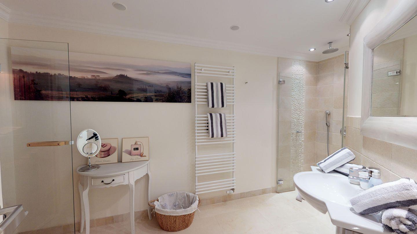 Im Untergeschoss befindet sich ein weiterer komfortabler Doppelschlafraum mit einem eigenen Fernseher, sowie ein Duschbad mit Sauna.