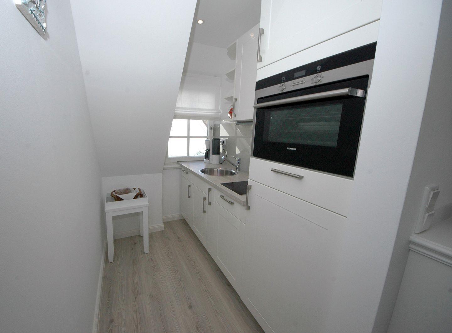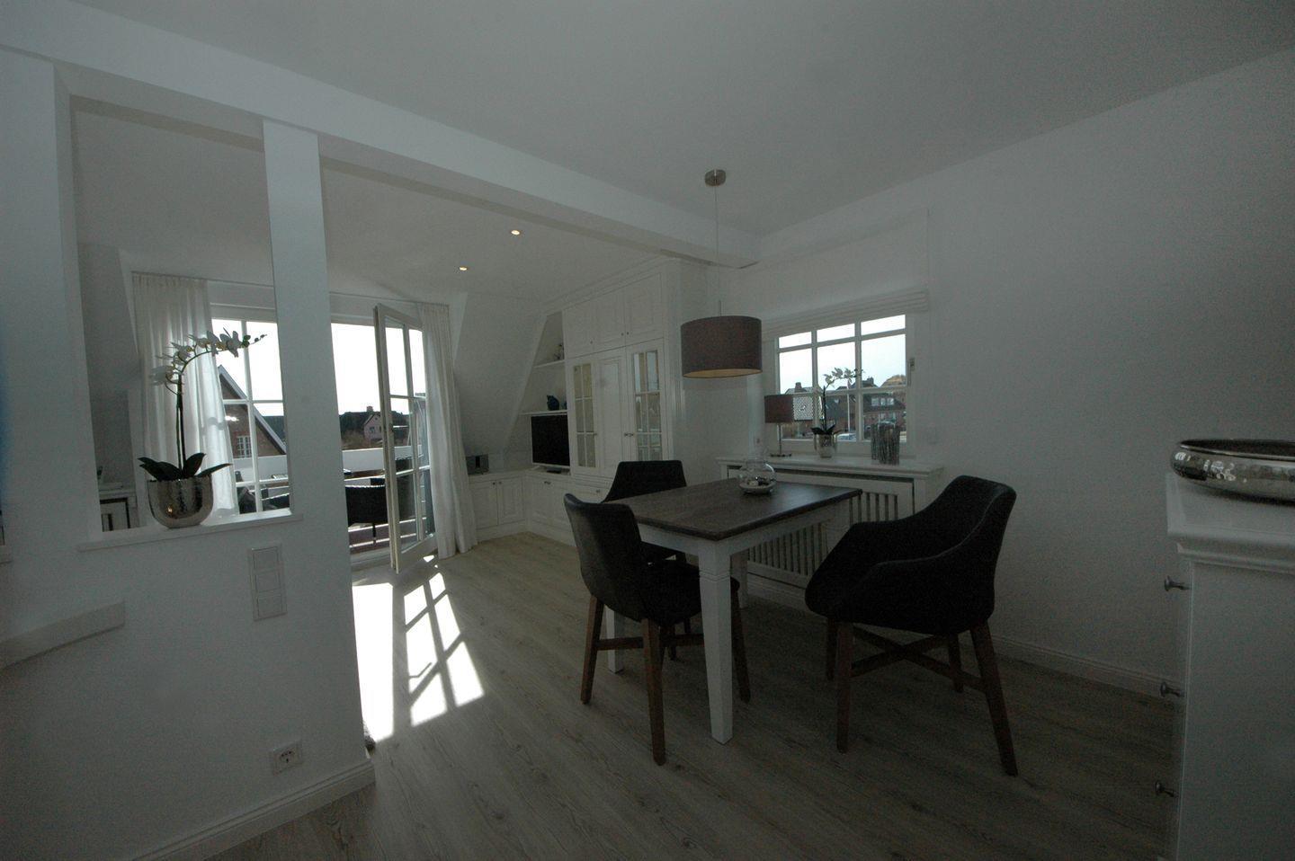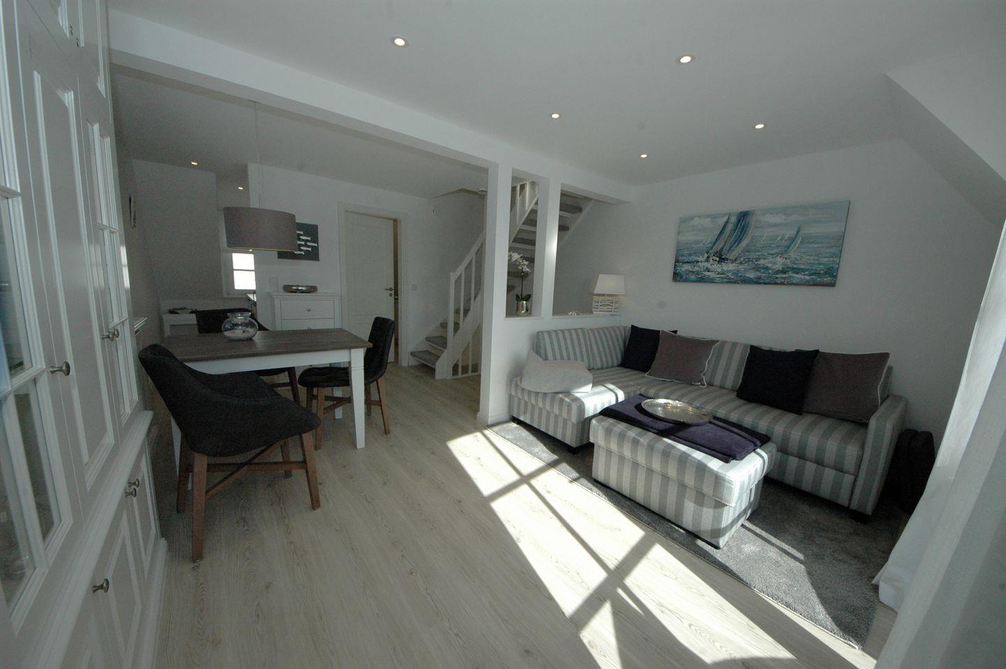 Das Obergeschoss begrüßt Sie mit einem großzügigen, lichtdurchfluteten Wohn-/Essbereich, der eine voll ausgestattete Küchenzeile beherbergt. Von hier aus haben Sie Zugang zu einem sonnigen Südbalkon, auf dem Sie die frische Nordseeluft in vollen Zügen genießen können. Ein modernes Duschbad vervollständigt diesen Bereich.