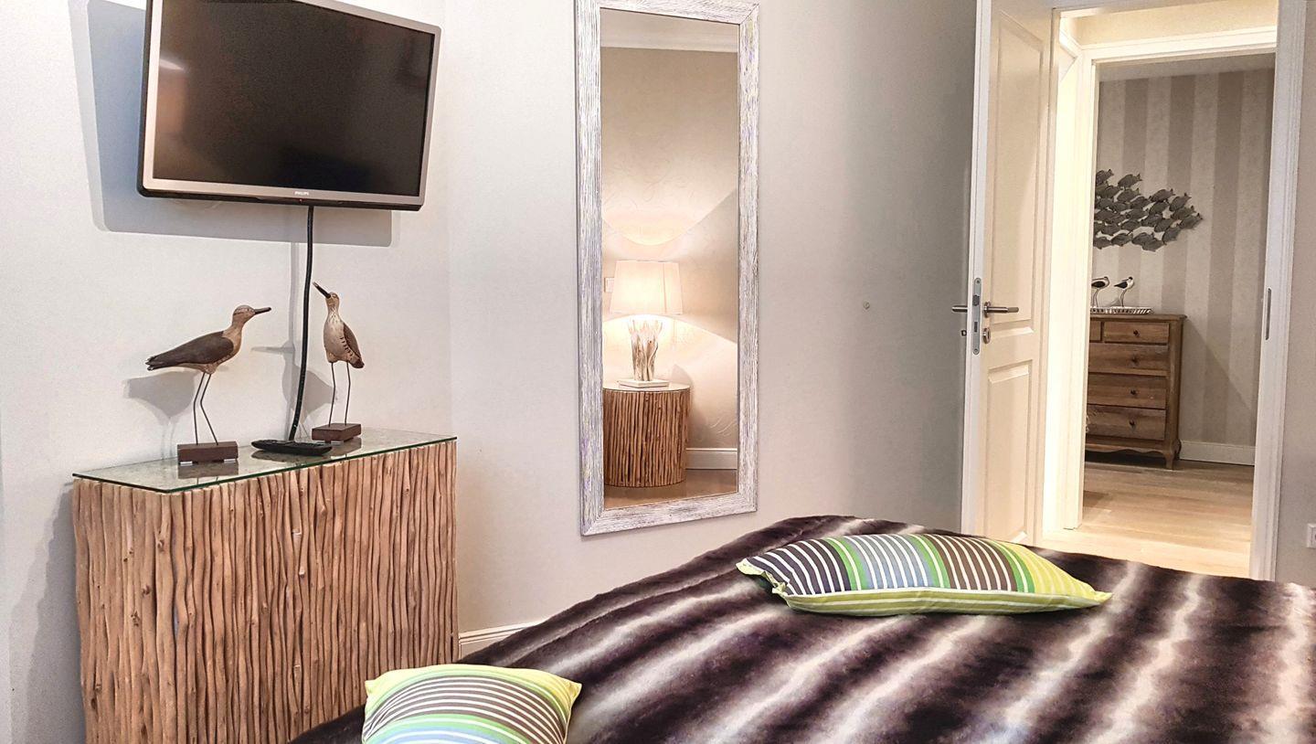 Im Erdgeschoss erwartet Sie ein Wohn-Esszimmerbereich mit edlem Marmorboden und einem 3D-Elektrokamin für ein perfektes Wohlgefühl. Im Souterrain befinden sich ein Doppelschlafraum und ein Schlafraum mit zwei getrennten Betten, beide mit hochwertigem Eichenboden und Boxspringbetten. Das stilvolle Bad ist mit Marmorboden, Fußbodenheizung und einer luxuriösen Regendusche ausgestattet. Ein eigener Parkplatz am Haus und die Nutzung von Waschmaschine/Trockner im Waschkeller runden die Annehmlichkeiten ab.