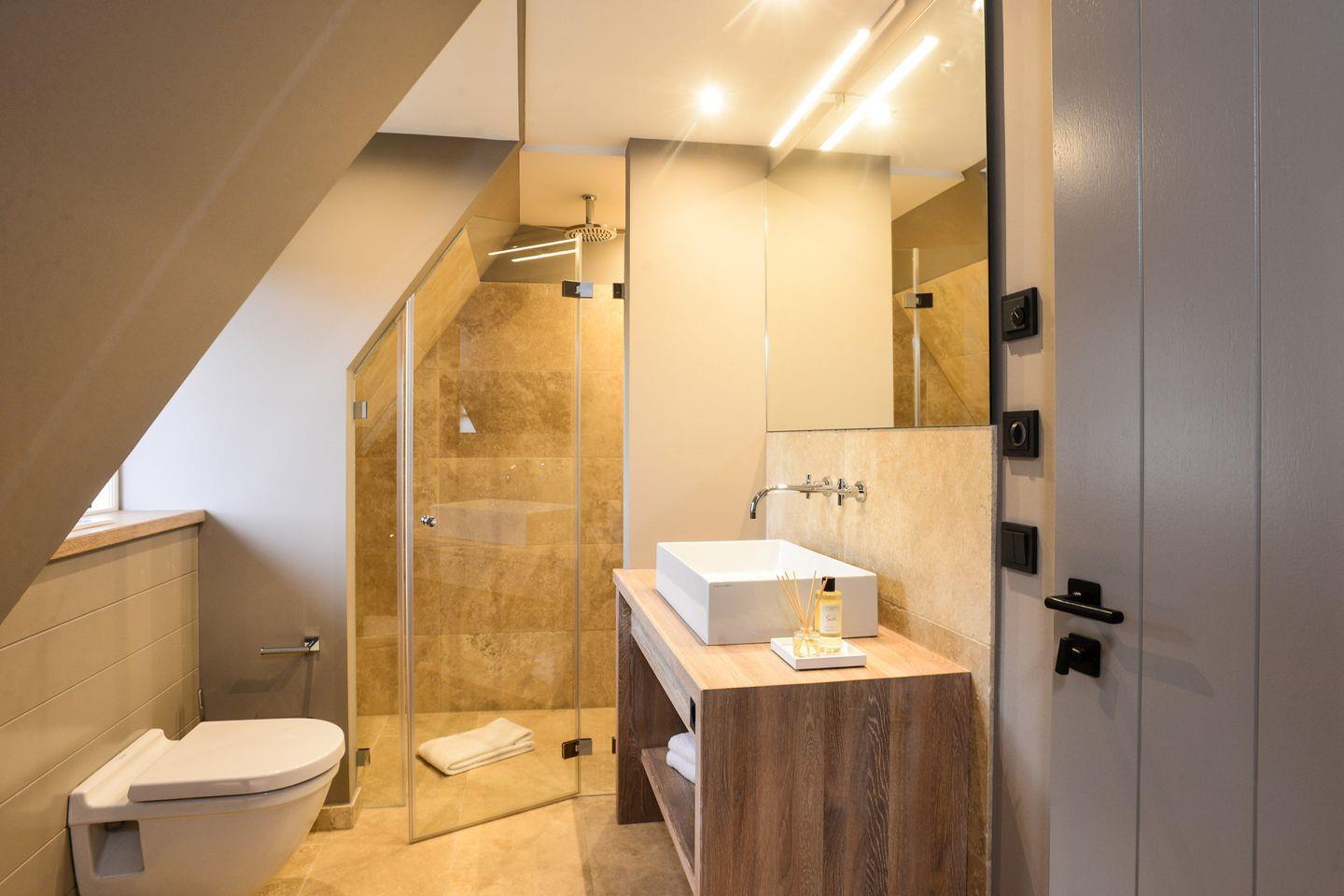 Im Dachgeschoss erwarten Sie zwei separate Masterbedrooms mit begehbaren Kleiderschränken und jeweils eigenem Bad, wobei eines sogar eine beleuchtete Badewanne bereithält. Alle Zimmer zeichnen sich durch hochwertige Tischlereinbauten mit durchdachter Beleuchtung aus. Im Untergeschoss befinden sich zwei weitere Schlafzimmer, eines davon mit einer großzügigen und gemütlichen Schlafcouch, sowie ein weiteres Duschbad und eine geräumige Sauna.