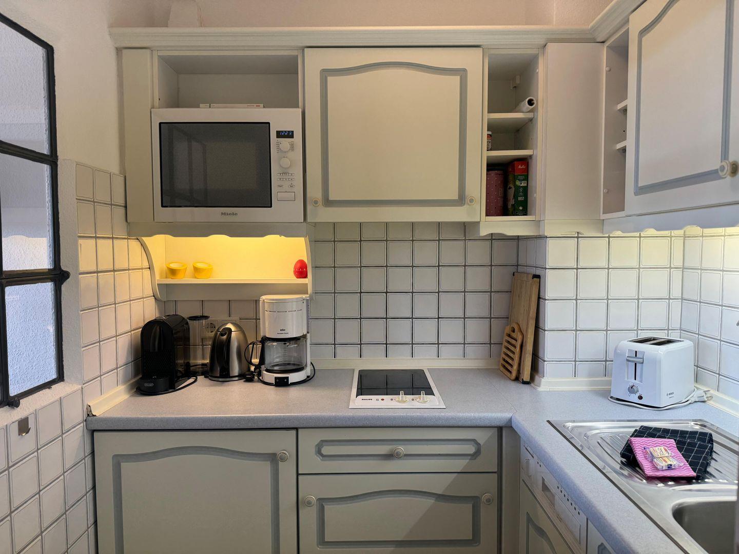 Die voll ausgestattete Küche ist ein echter Pluspunkt! Mit Glaskeramikkochfeld, Mikrowelle mit Backfunktion, Spülmaschine, Kühlschrank mit Gefrierfach, Kaffeemaschine, Wasserkocher und Toaster lassen sich kulinarische Wünsche problemlos umsetzen. Das Badezimmer überzeugt mit einer modernen Dusche und einer stilvollen Ausstattung.