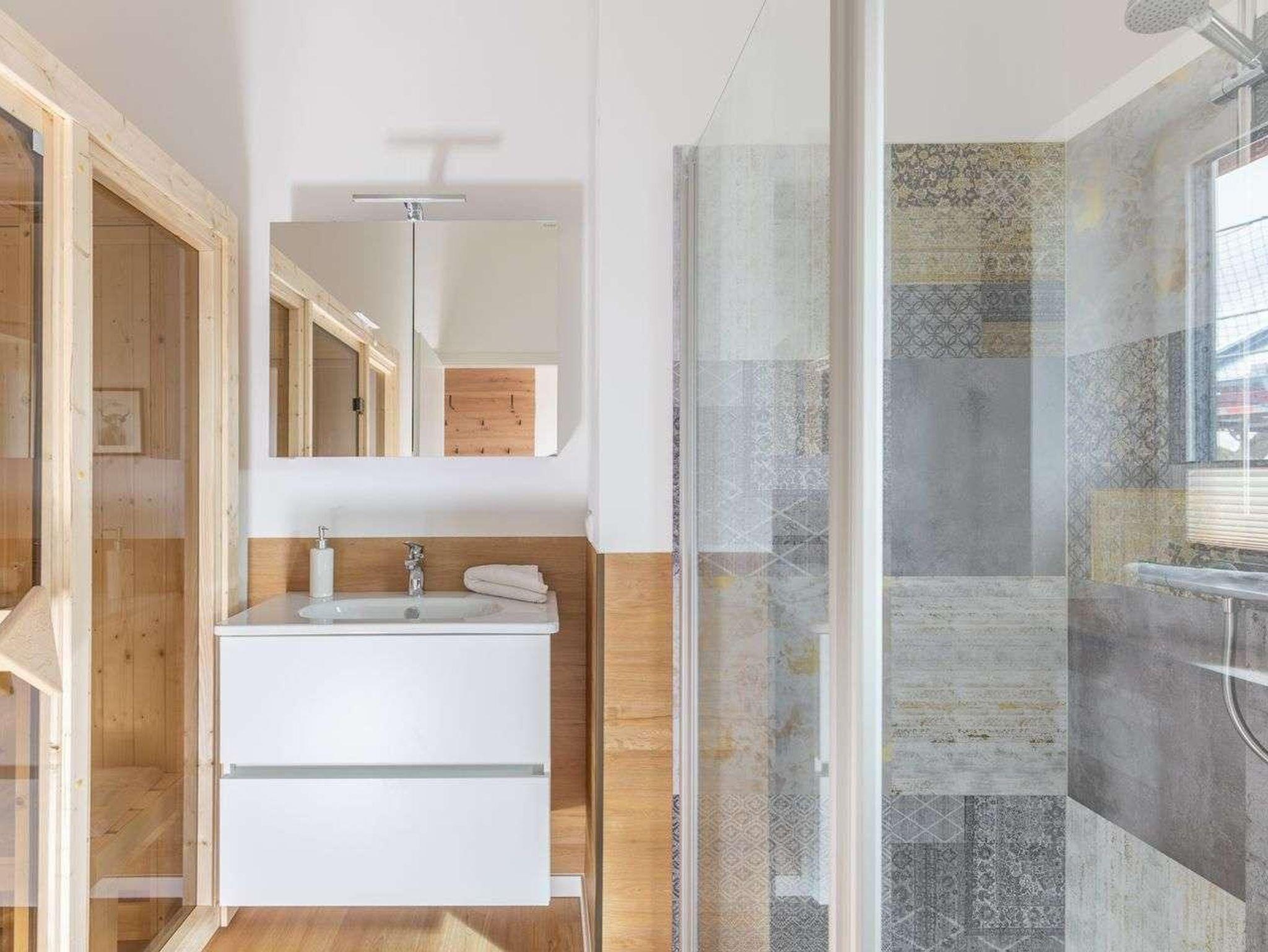 Ein modernes Badezimmer mit bodengleicher Dusche, WC und Sauna sowie ein zusätzliches Gäste-WC sorgen für besonderen Komfort.