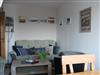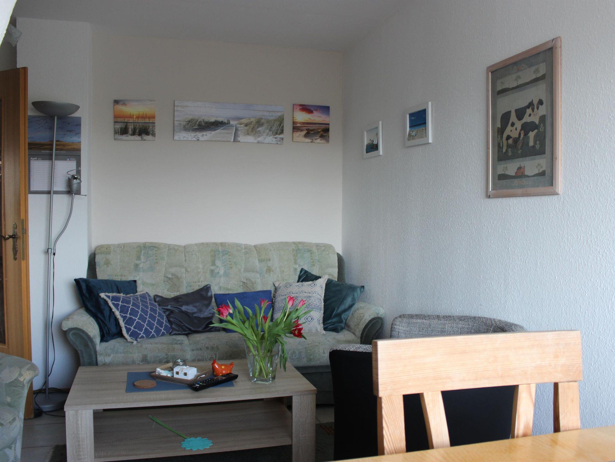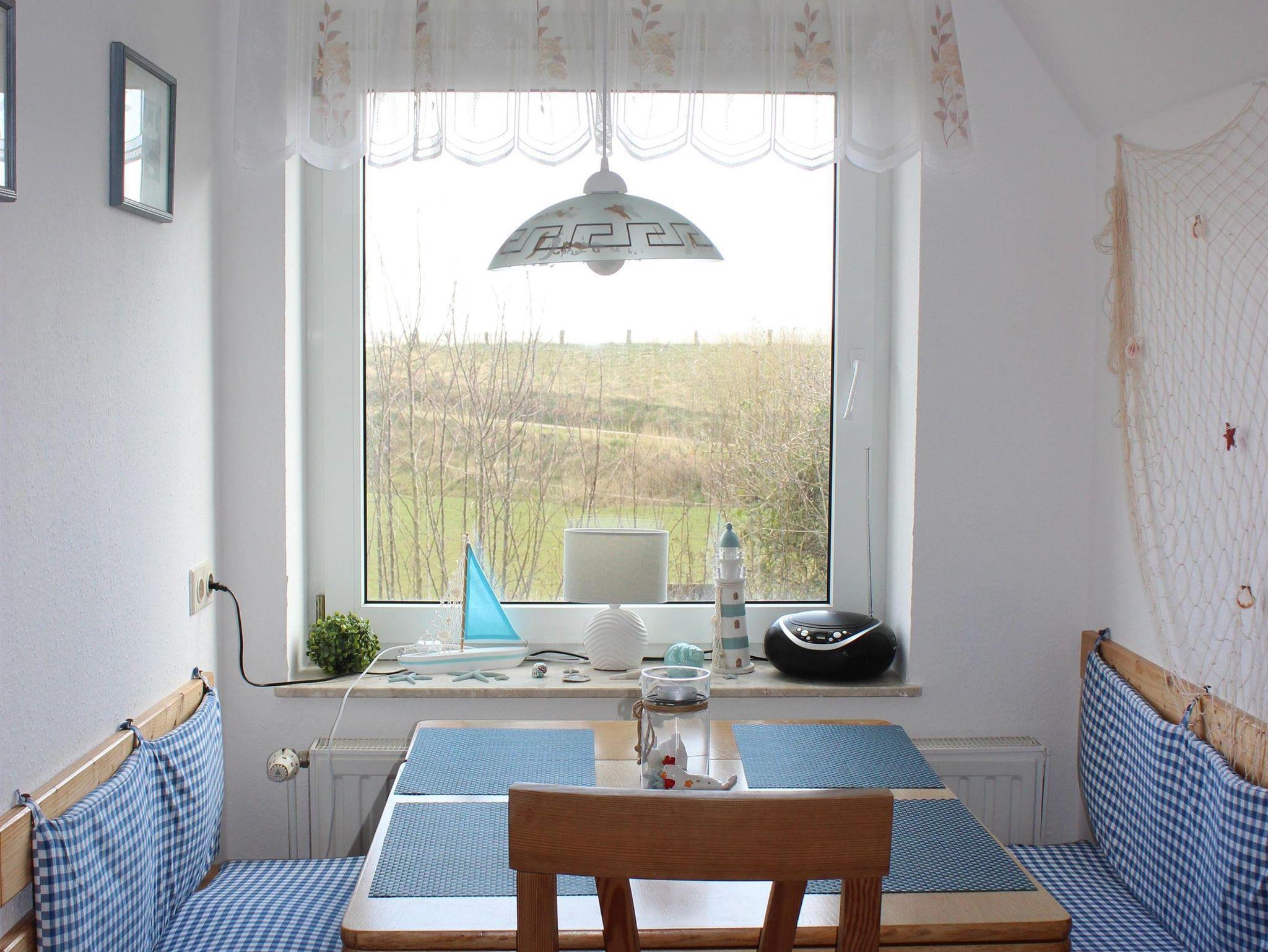 Wohnraum mit SAT-TV, offene Küche und Essbereich mit Blick zum Deich