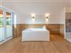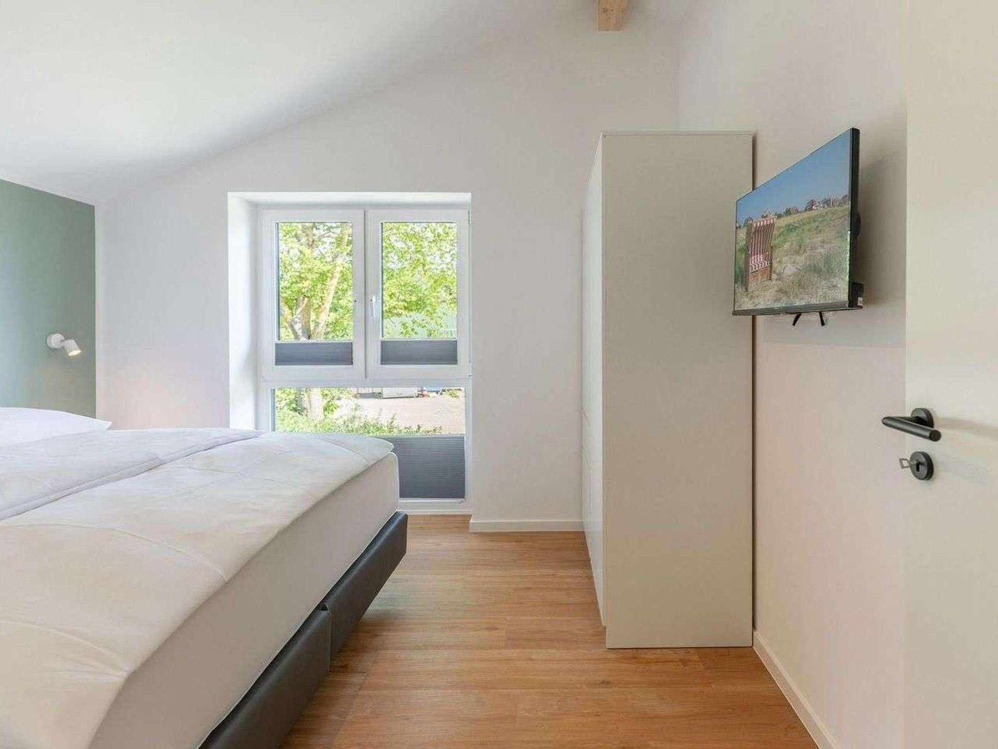 Ein modernes Badezimmer mit bodengleicher Dusche, WC sowie Sauna und einem Whirlpool sorgen für besonderen Komfort. Ein echtes Highlight ist der angrenzende Balkon mit wunderbarer Aussicht über das Katinger Watt!