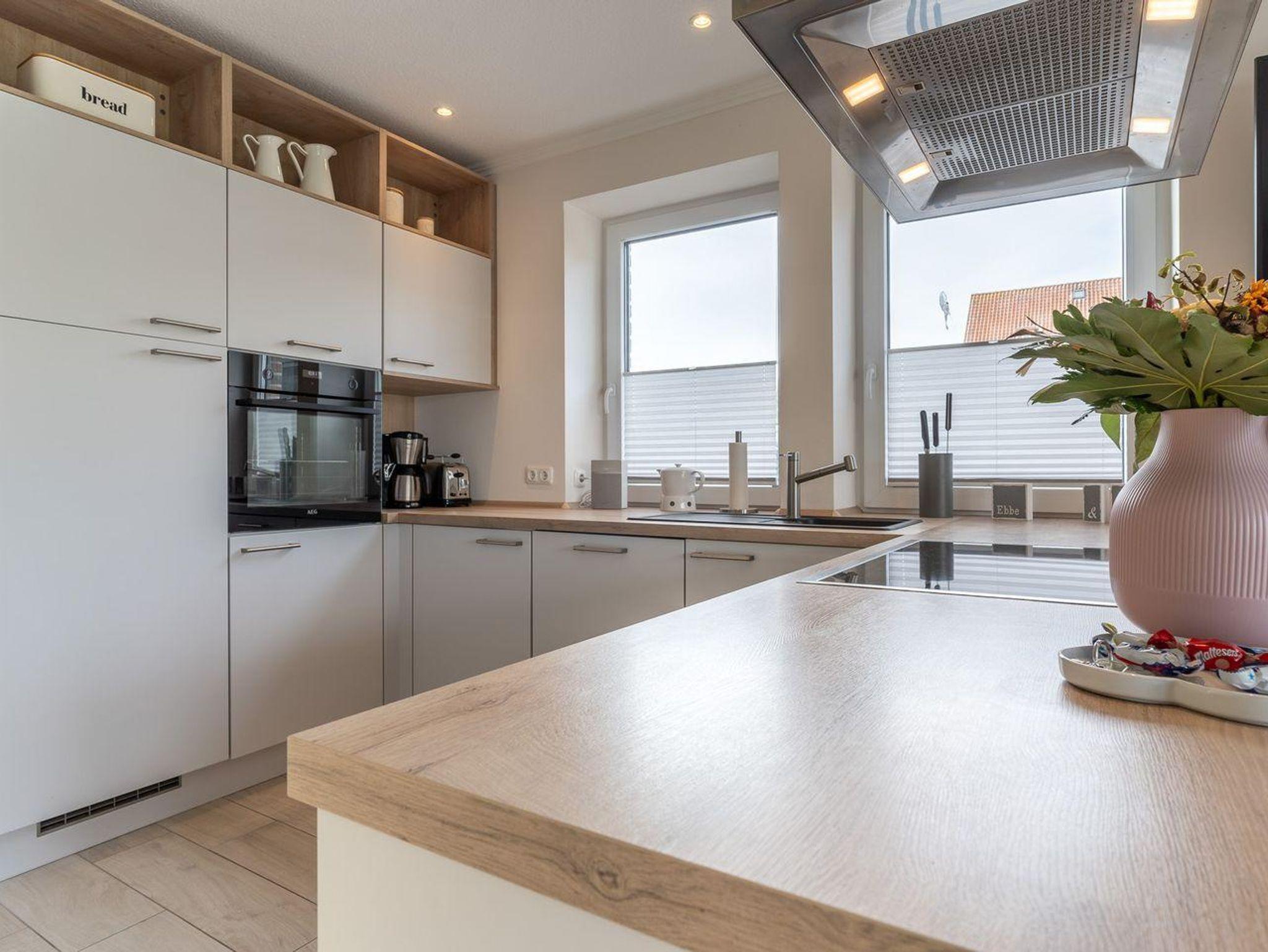 Die moderne Einrichtung des Ferienhauses umfasst alle Annehmlichkeiten, die Sie sich wünschen können. Eine eigene Sauna erwartet Sie, um Körper und Geist zu verwöhnen, während der Ofen an kühleren Abenden eine behagliche Atmosphäre schafft. Die gemütlichen Schlafzimmer bieten nicht nur erholsame Nächte, sondern auch beeindruckende Ausblicke auf den Hafen und die Eider. Die großzügige und moderne Wohnküche lädt zum gemeinsamen Kochen und Genießen ein.