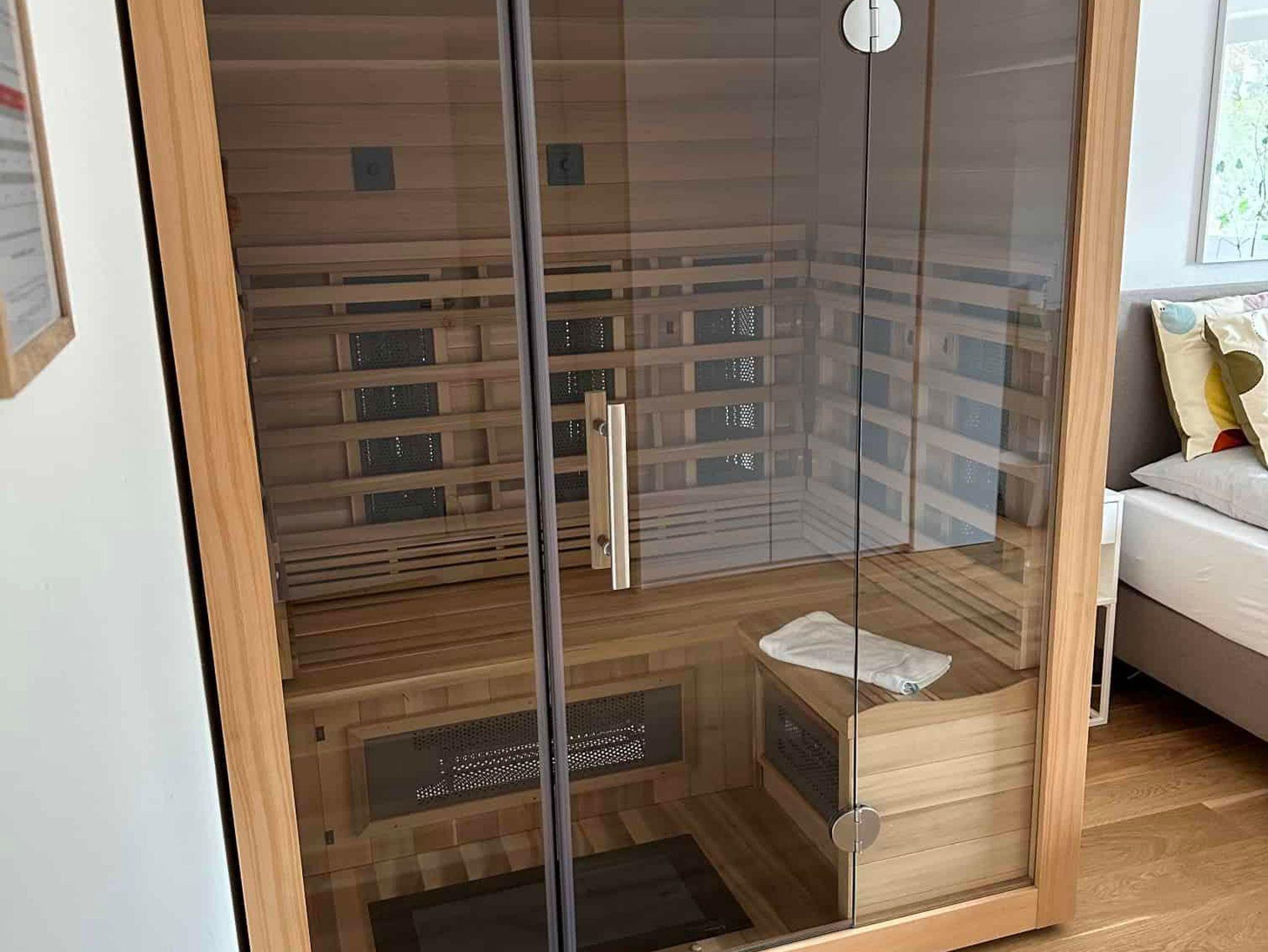 Im hellen Flur erwartet Sie unser Willkommensgeschenk mit nachhaltigen Produkten. Von hier aus gelangen Sie in das Elternschlafzimmer mit Boxspringbett mit durchgehender Matratze,NEU: Infrarotsaunakabine, Home-Office-Arbeitsplatz und optionalem Babybett, das Kinderzimmer für zwei Kinder mit vielen Spielmöglichkeiten und einem optionalen Zusatzzimmer mit breitem Bett für eine weitere Person. Die Kinderzimmer sind mit Verdunklungsplissees und das Elternschlafzimmer mit Verdunklungsvorhängen ausgestattet. Hinter der voll ausgestatteten Einbauküche mit Spülmaschine, Mikrowelle, Backofen und Senseo Kaffeemaschine befinden sich der Hauswirtschaftsraum mit Waschamschine und Trockner.
