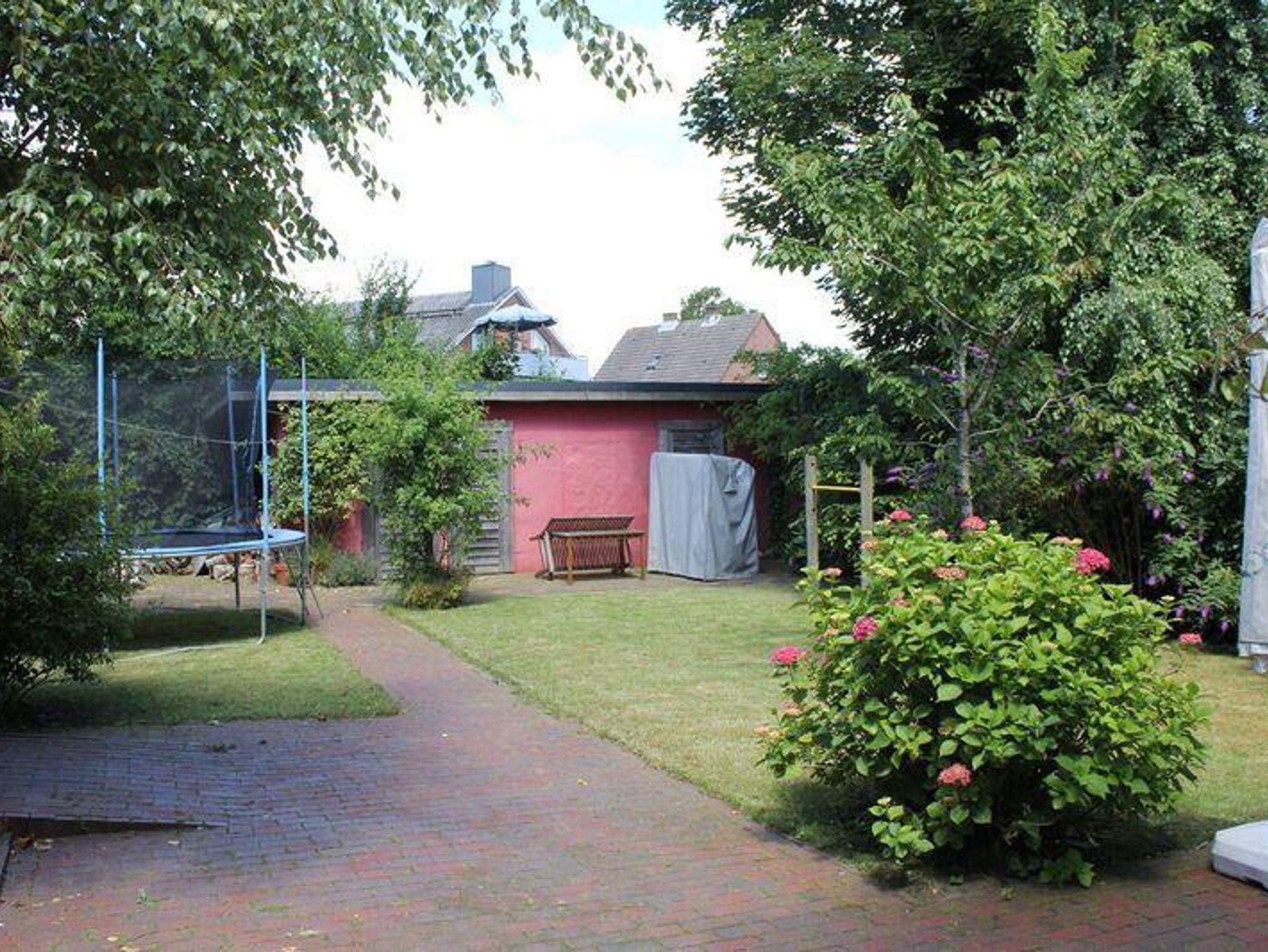 Garten mit möblierter Terrasse, Sonnenschirm, Grill. Das Trampolin steht leider nicht mehr zur Verfügung