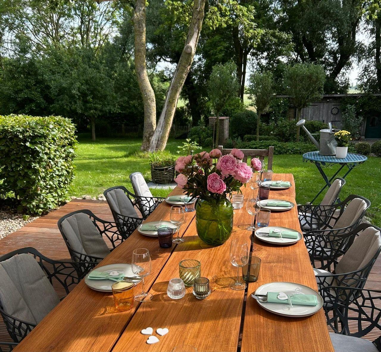 Der großzügige Außenbereich auf einem 3900 m² großen Grundstück lässt keine Wünsche offen. Zwei Sonnenterrassen, ausgestattet mit bequemen Sonnenliegen und einem traditionellen Strandkorb, laden zum Sonnenbaden und Entspannen ein. Der weitläufige Garten bietet außerdem Platz für Aktivitäten wie Tischtennis oder Spielen mit den Kindern. Für Hundebesitzer gibt es viel Raum, um den Vierbeiner toben zu lassen.