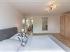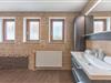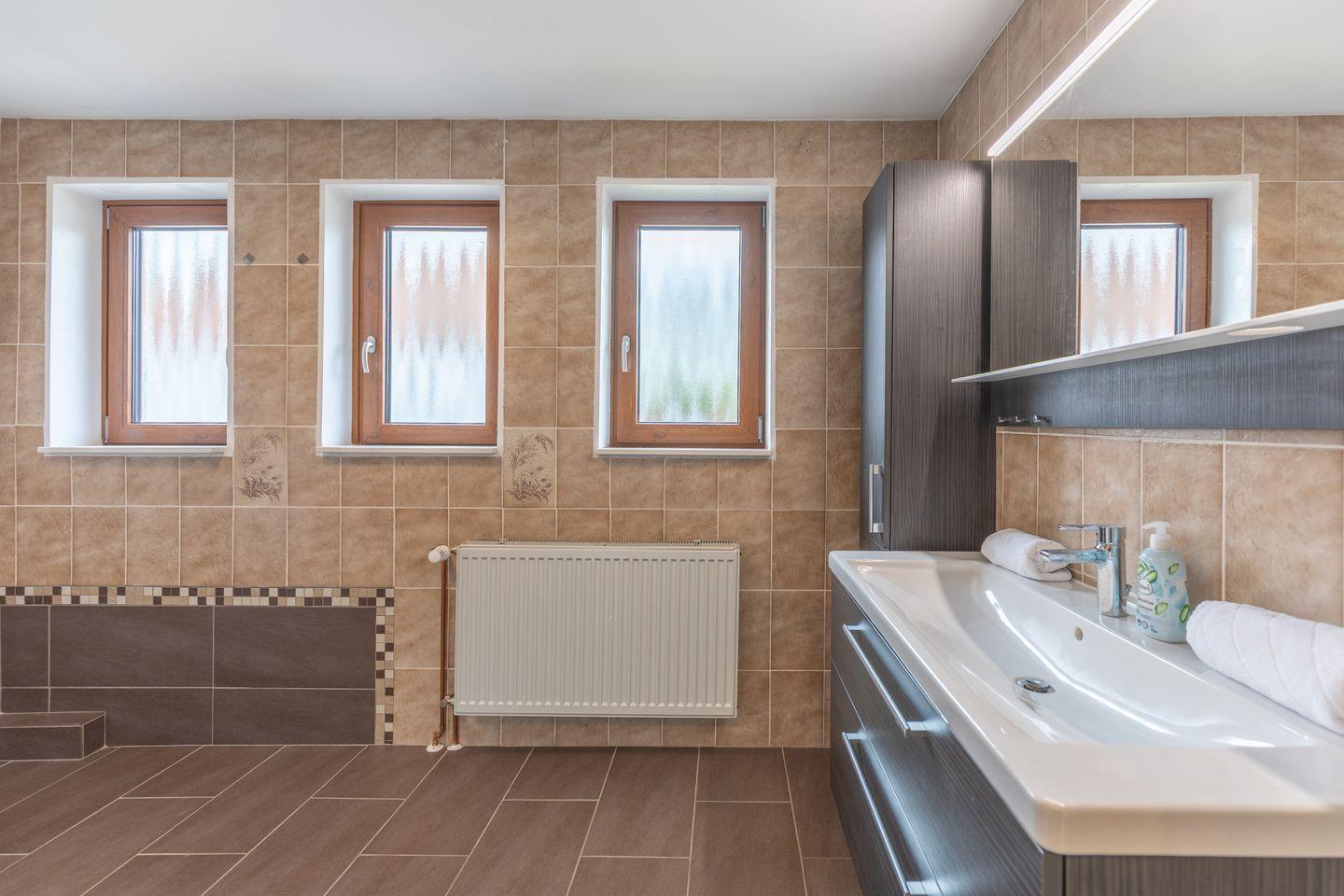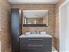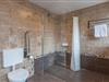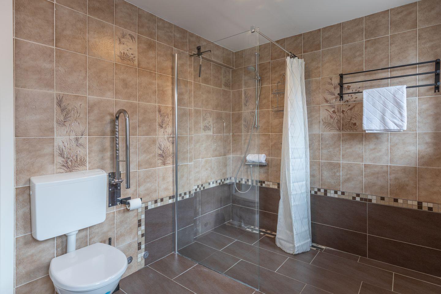 Das moderne Badezimmer ist mit einer ebenerdigen Dusche, WC und Waschbecken ausgestattet. Ein Haartrockner und Kosmetikspiegel sind ebenfalls vorhanden.