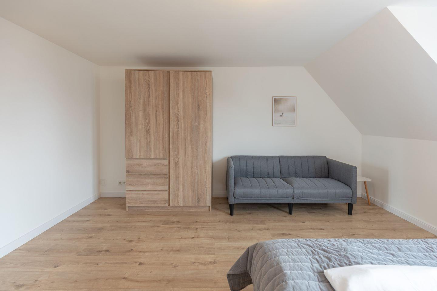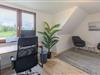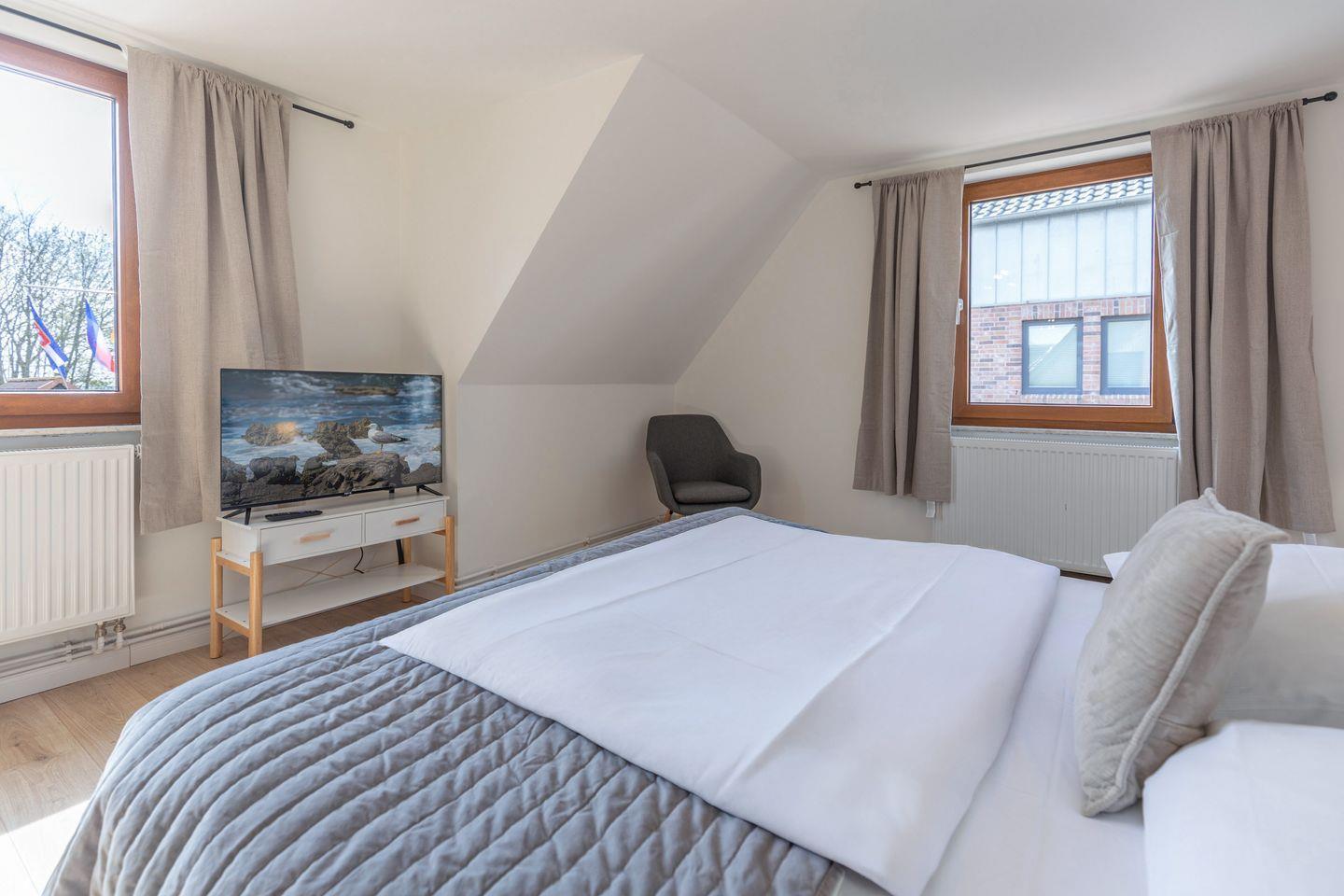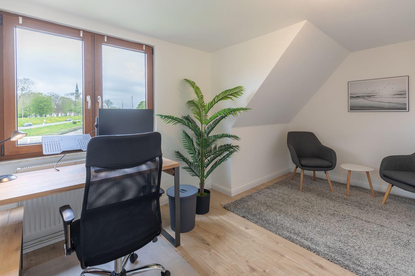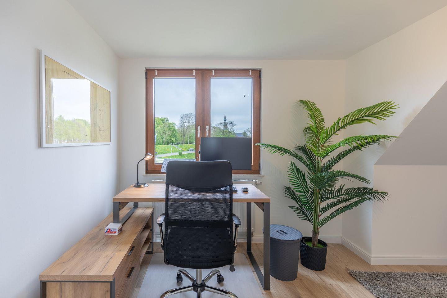 Eine Holztreppe führt Sie in das Obergeschoss, wo sich drei Schlafzimmer befinden. Zwei der Zimmer sind jeweils mit einem Doppelbett (1,80 x 2,00 m) ausgestattet, während das dritte Schlafzimmer über zwei Einzelbetten (je 90 x 2,00 m) verfügt. Zusätzlich steht Ihnen ein separater Raum als Homeoffice zur Verfügung – mit Schreibtisch und Monitor, ideal zum Arbeiten mit Blick auf den Tönninger Hafen.