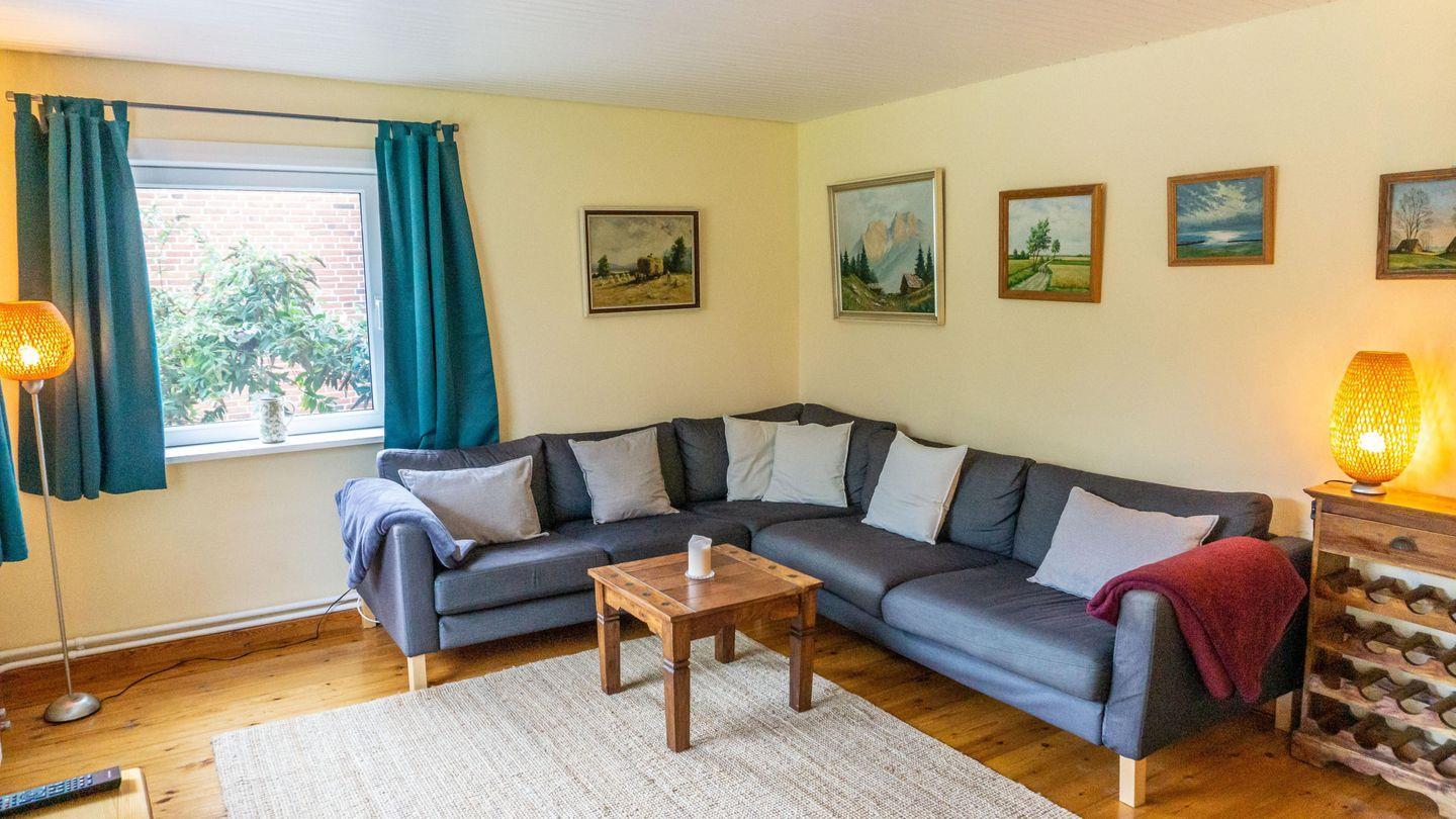 Im Erdgeschoss erwartet Sie ein großzügiger Wohnbereich mit Dielenboden, Sofaecke und moderner Unterhaltungselektronik, darunter ein Fernseher (35–44 Zoll, Satelliten-TV), CD-Spieler und Radio.