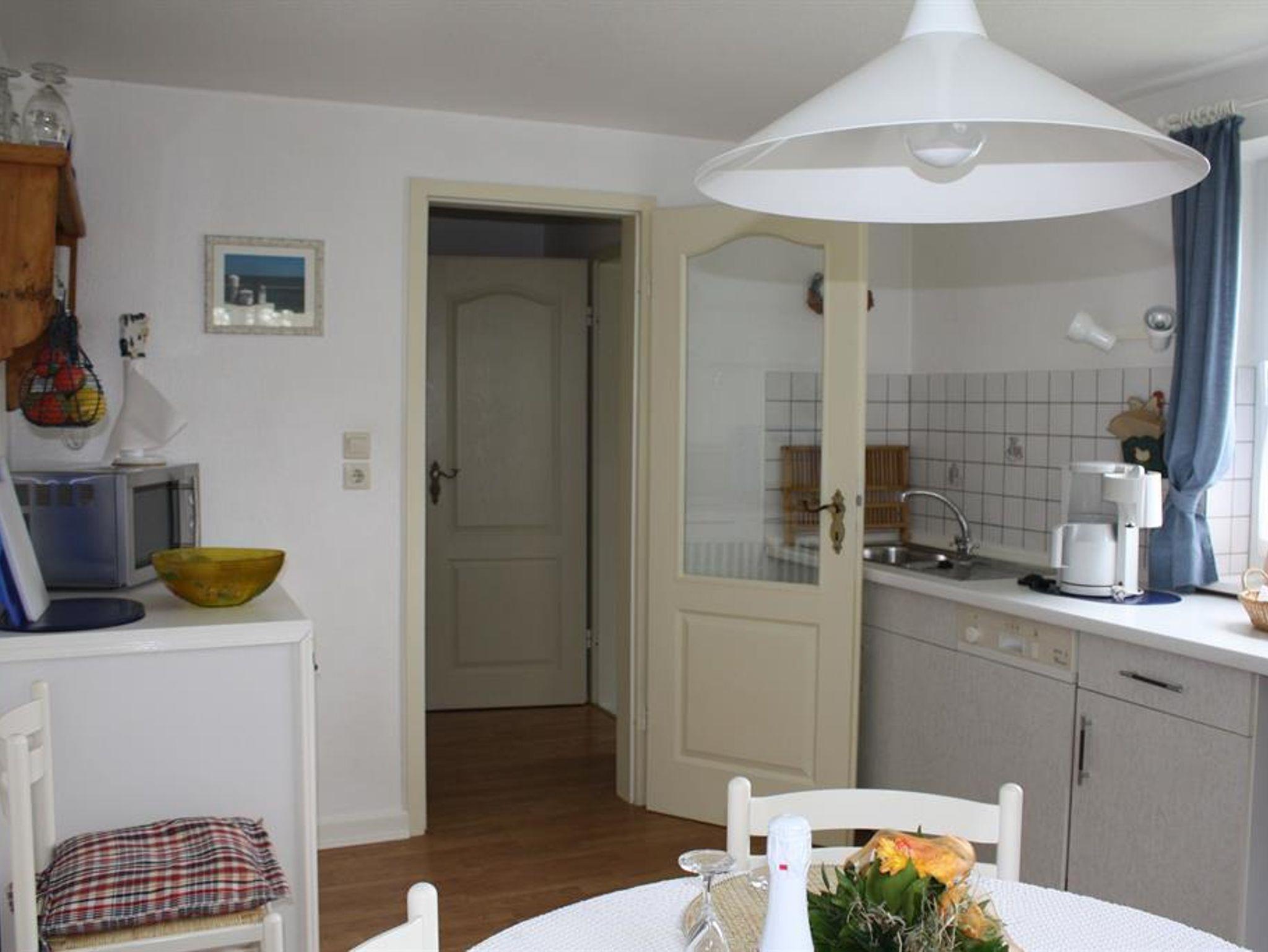 Liebevoll und komfortabel eingerichtete Ferienwohnung mit einer Größe von 85 qm, für bis zu 5 Personen. Wohnraum mit Sitzecke und SAT-TV. Einbauküche mit 4-Plattenherd und Geschirrspüler, Duschbad mit WC. Im Obergeschoss befinden sich ein Schlafraum mit Doppelbett und ein Schlafraum mit Etagebett und einem Einzelbett.