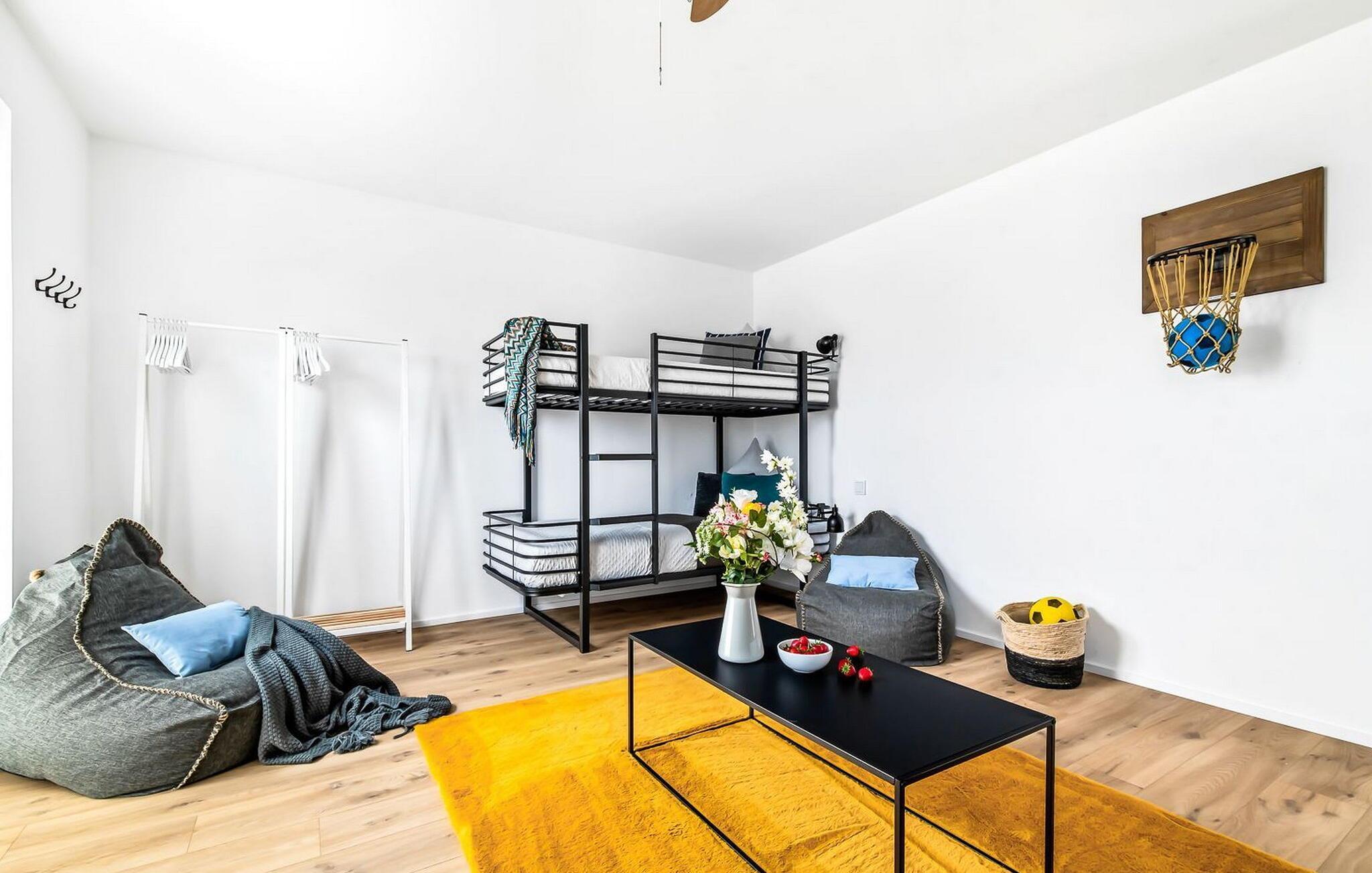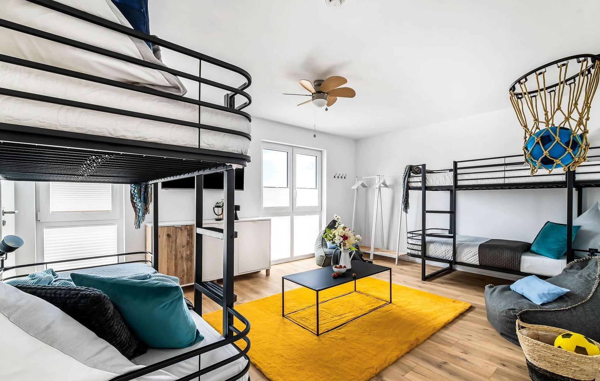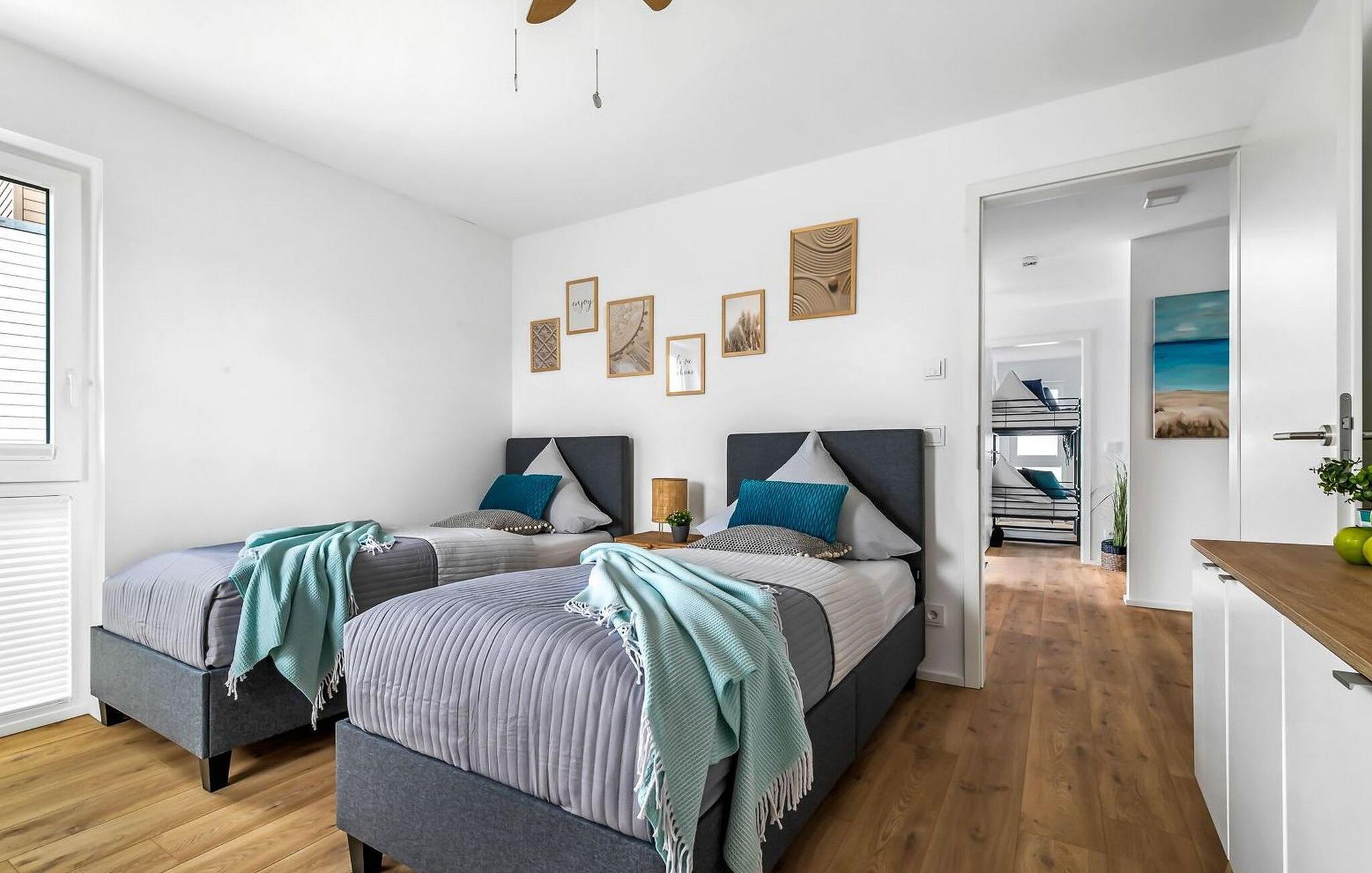 Ein Schlafzimmer ist mit einem hochwertigen Boxspring-Doppelbetten ausgestattet und das zweite Schlafzimmer bieten zwei separaten Einzelbetten. Im dritten Schlafzimmer erwartet euch Jugendlounge-Feeling mit eigenem Fernseher und Sitzsäcken. Hier habt ihr zwei Kajüten-Betten die sich auf vier Schlafplätze erweitern lassen.
