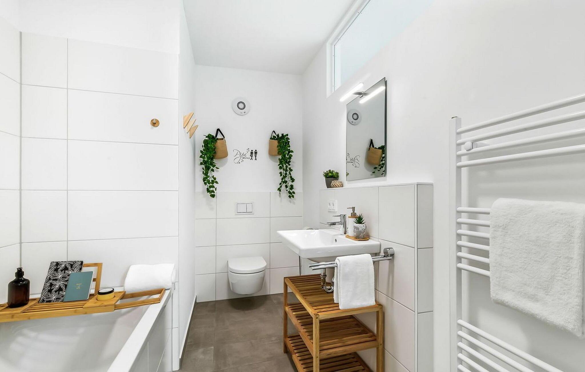 Ebenfalls in der oberen Etage befindet sich ein zweites Badezimmer mit Badewanne welches das Wohlfühlfeeling abrundet und zu jeder Jahreszeit für einen erholsamen Aufenthalt sorgt.