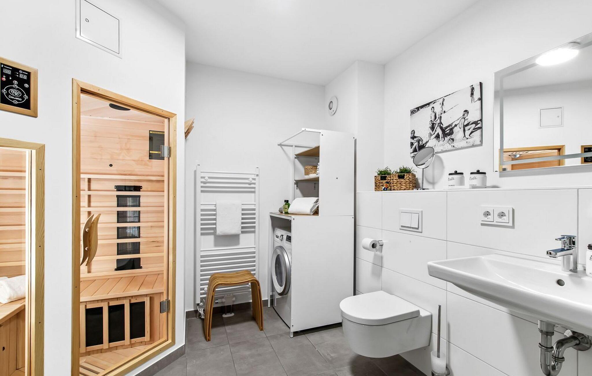 Zudem befindet sich auf dieser Etage ein Wellnessbad mit bodengleicher Dusche, Infrarot Sauna und einem großen Spiegel.