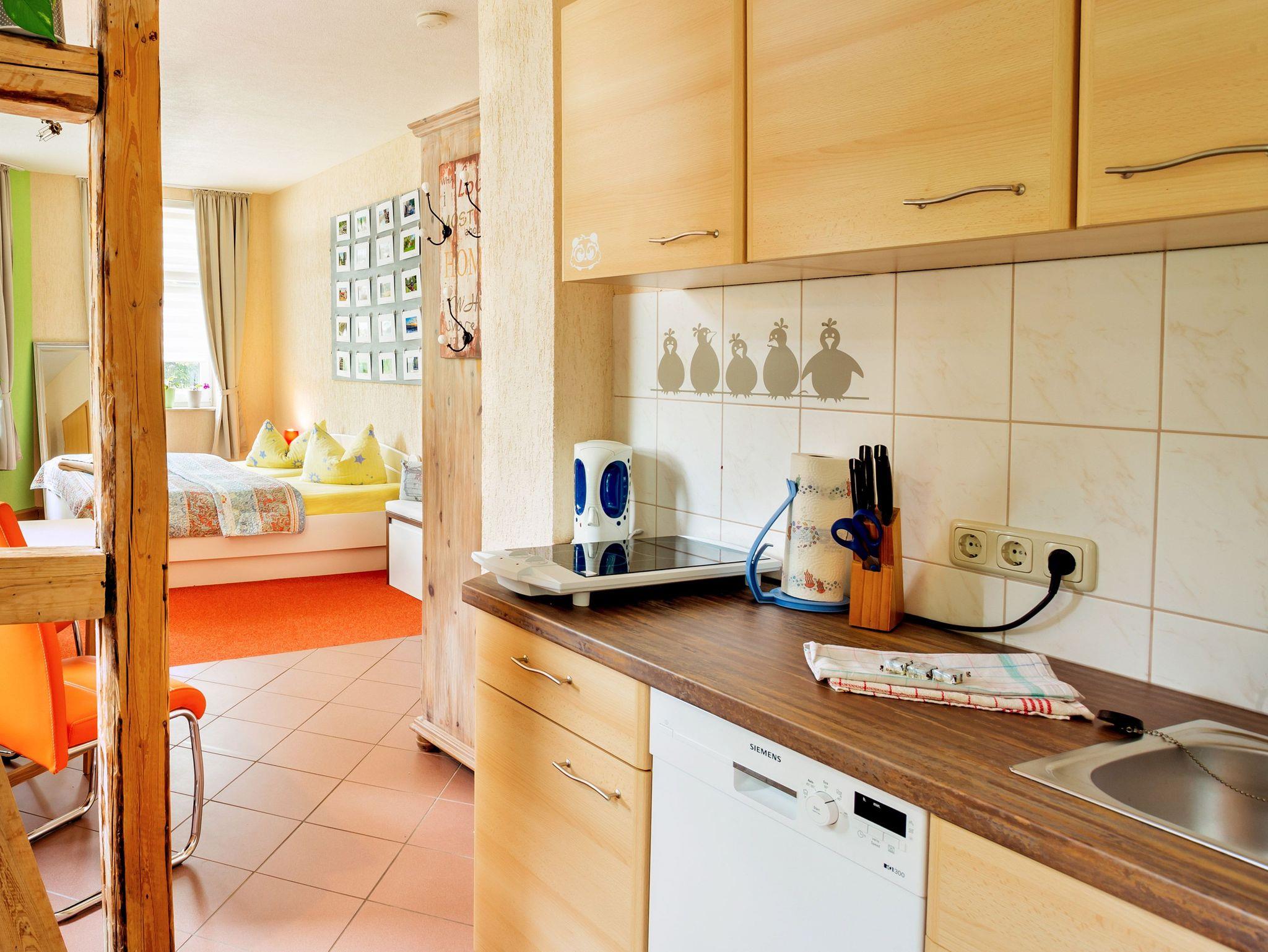 Die offene Küche ist mit einem 2-Platten-Kochfeld, einem Backofen mit integrierter Mikrowelle, einer Spülmaschine, Kaffeemaschine, Toaster und einem Esstisch mit 2 Stühlen ausgestattet. Im hellen Badezimmer mit Tageslichtfenster erwartet Sie eine Dusche.