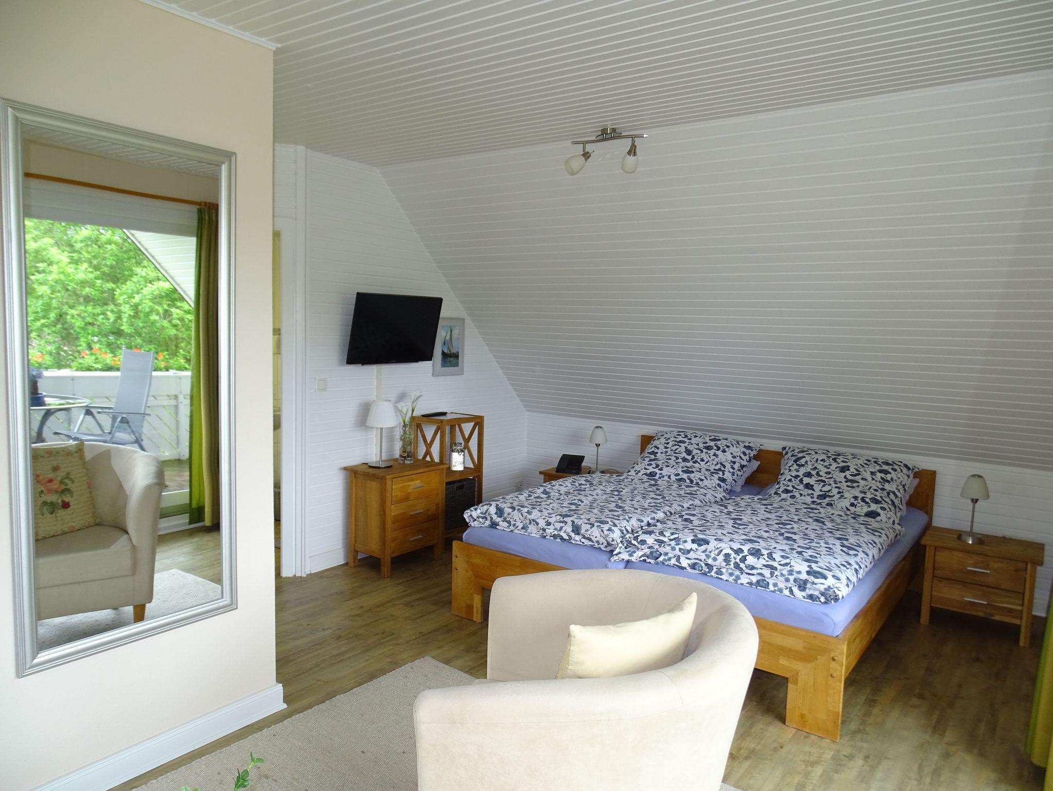 Im Apartment 1 (mit separater Küche) erwartet Sie ein Schlafzimmer mit Doppelbett, TV und Sitzecke. Das Duschbad mit Tageslicht ist direkt vom Schlafzimmer aus begehbar. Die Küche ist bestens ausgestattet mit Wasserkocher, Kaffeemaschine, Kühlschrank, Herd und Backofen sowie einer Mirkowelle und einem Esstisch für zwei Personen.