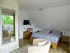 Im Apartment 2 (mit Pantryküche) erwartet Sie ein Wohn- und Schlafzimmer mit Doppelbett, Sitzecke und TV sowie einem kleinen Esstisch und einer Pantryküche. Die kleine Kochnische ist mit Geschirr, Wasserkocher, zwei Herdplatten, Kühlschrank, Mikrowelle und einer Kaffeemaschine ausgestattet. Das Duschbad mit Tageslicht ist direkt vom Schlafbereich begehbar.