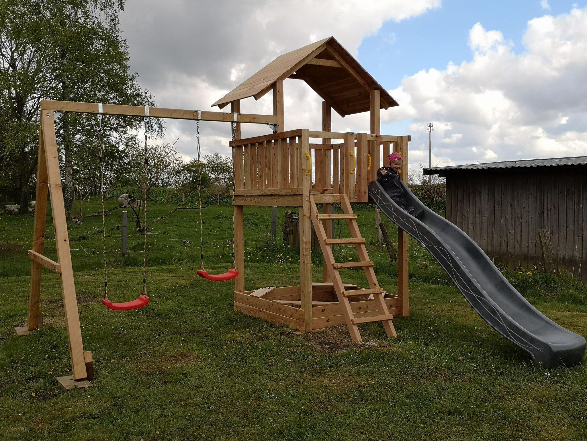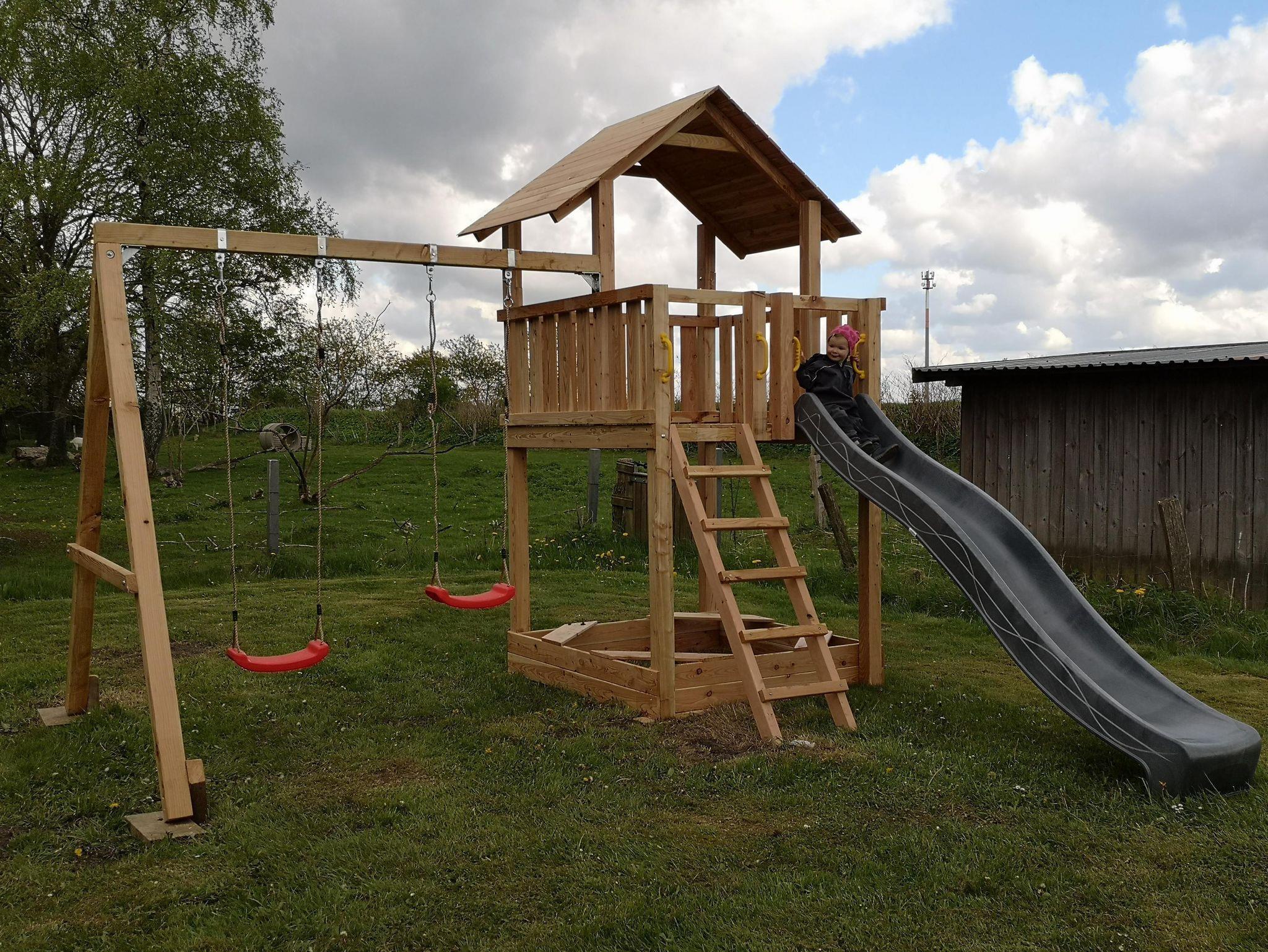 • Angrenzend an die Terasse ist eine große Liegewiese mit Kinderspielbereich: Sandkiste, Riesen-Trampolin, Schaukel, Rutsche und Kletterreck.