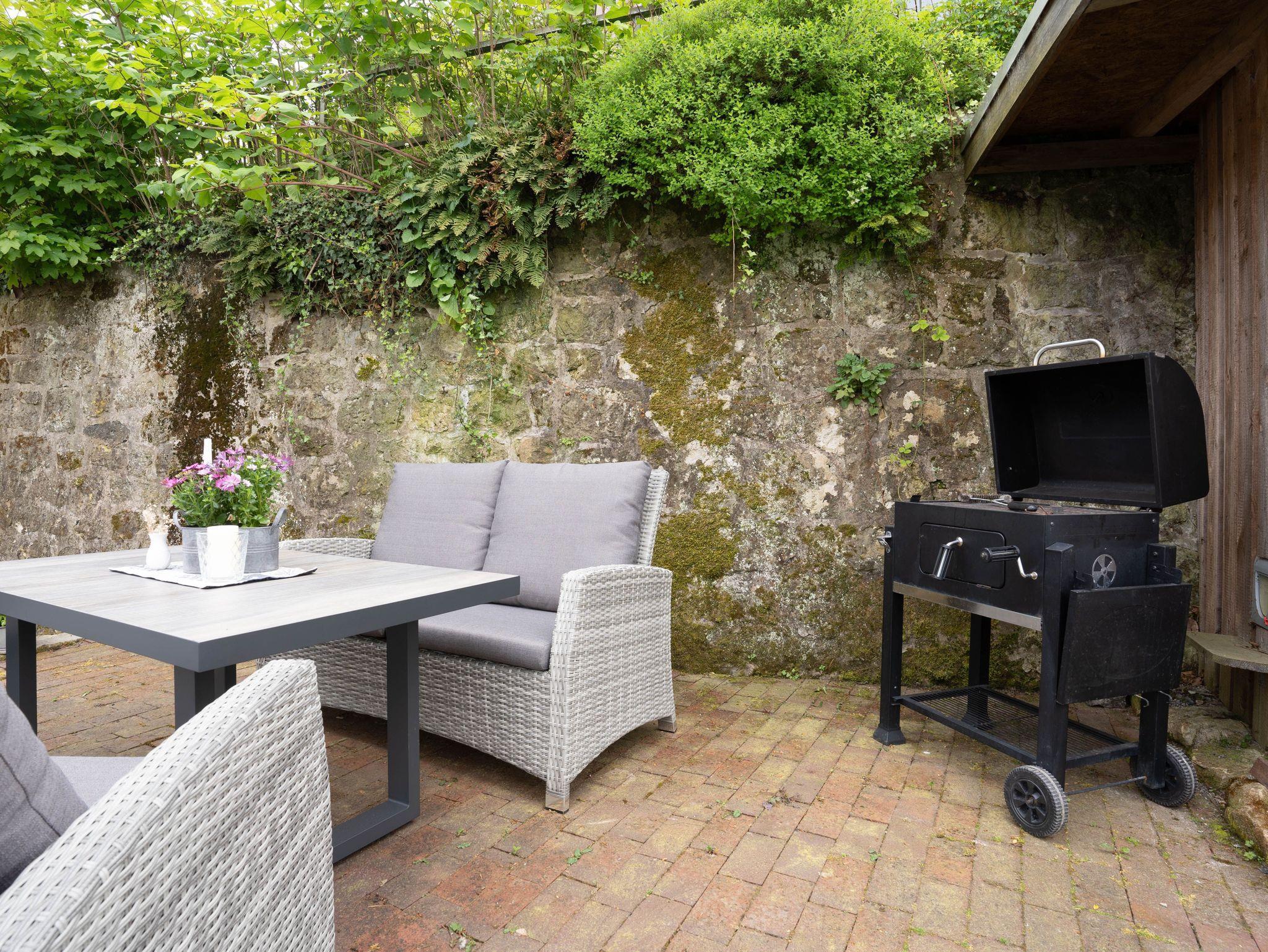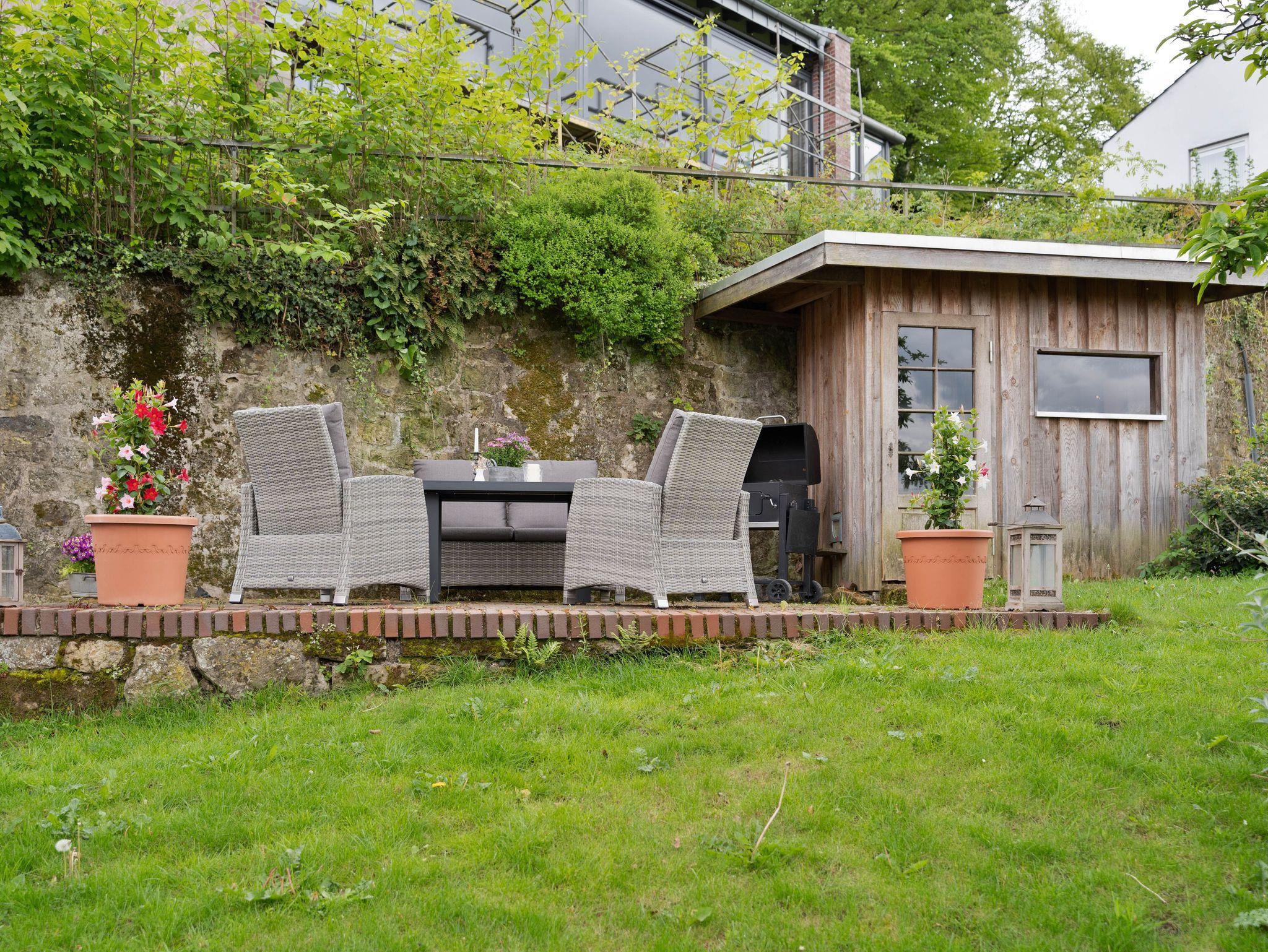Der Garten des Hauses liegt auf der Westseite. Hier können Sie auf der Terrasse mit Gartenmöbeln und Sonnenschirm den Fernblick und die spektakulären Sonnenuntergänge genießen. Ein Grill mit Kohlekamin, Besteck und Holzkohle steht Ihnen hier zur Verfügung.