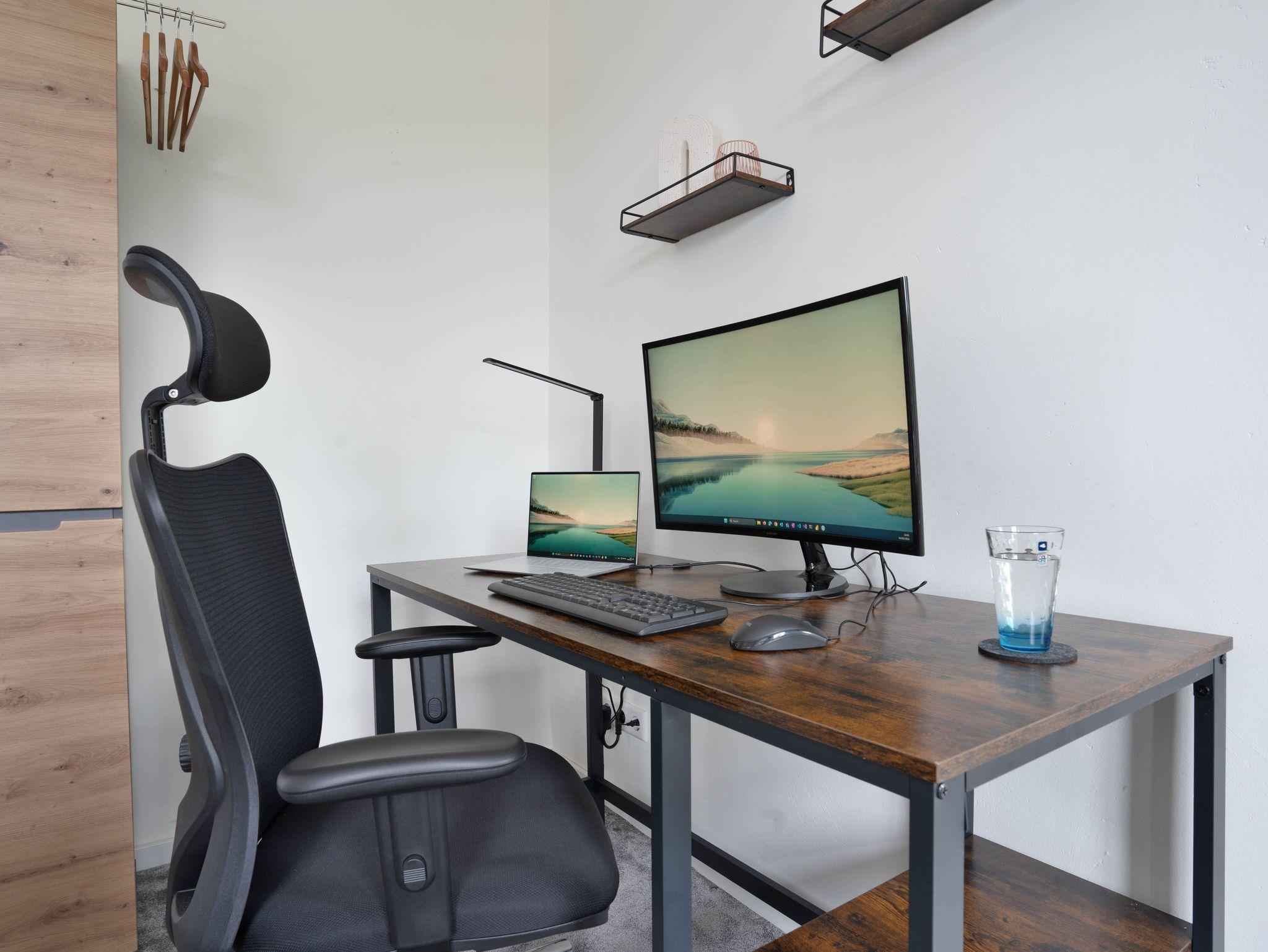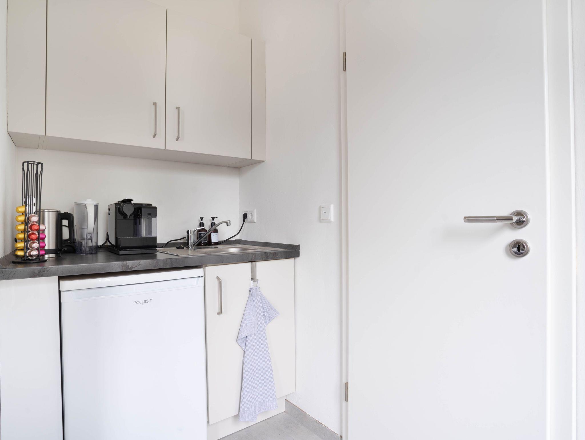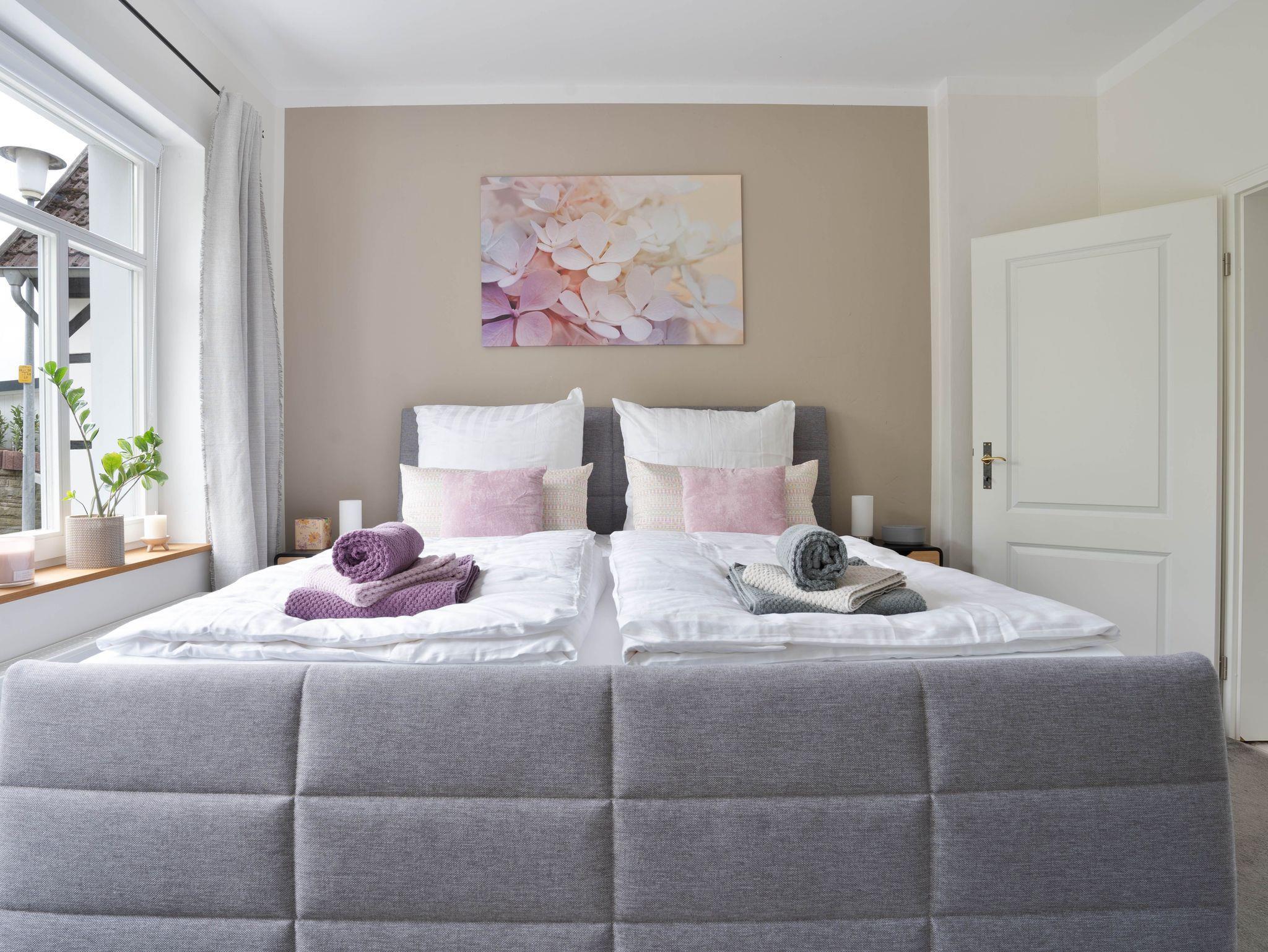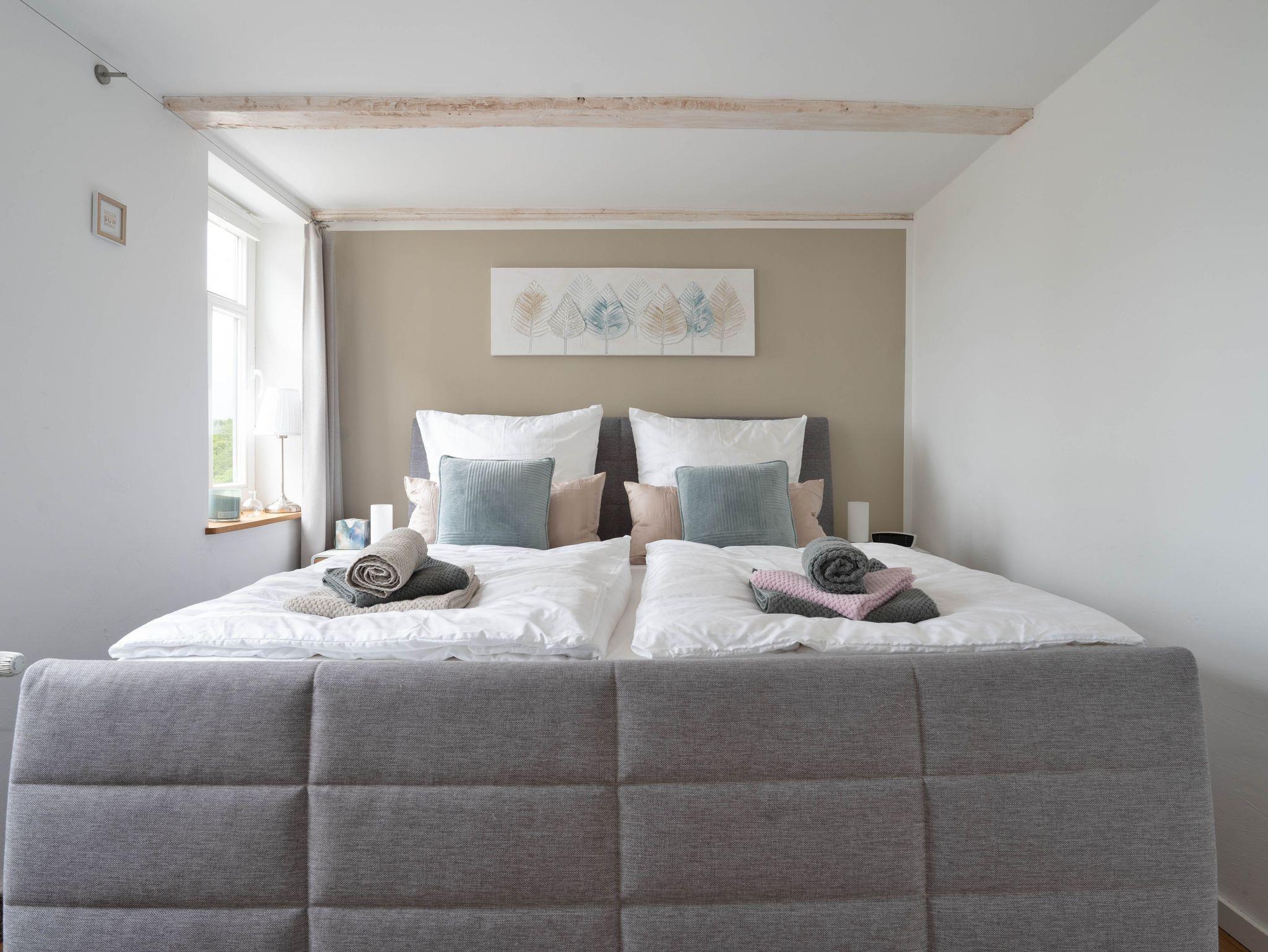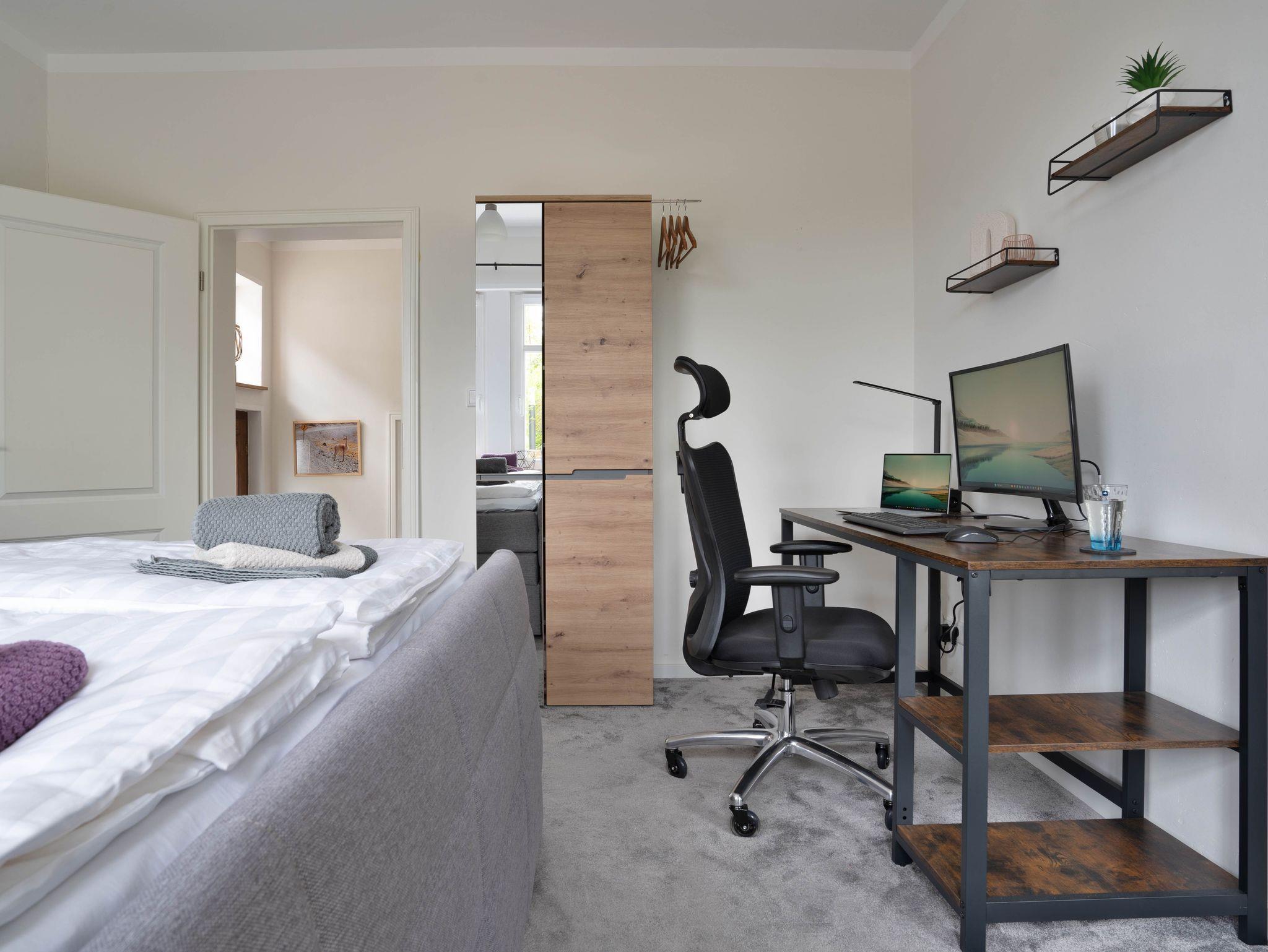 Alle Zimmer sind hochwertig ausgestattet. Es gibt 2 Schlafzimmer mit modernen Boxspringbetten 180x200 cm. Die Bettwaren sind allergikerfreundlich und für ein luxuriöses Hautgefühl mit Damastbettwäsche aus reiner Baumwolle bezogen. Jeder Gast erhält 3 Kissen und einen Nachttisch mit moderner Lampe, an der Sie Ihr Handy über ein USB-Kabel direkt am Bett laden können. Außerdem stellen wir Ihnen in jedem Schlafzimmer einen modernen Radiowecker und eine Taschentücherbox zur Verfügung. In jedem befindet sich ein Schrank und ein Ganzkörperspiegel sowie ein Abfalleimer. Im größeren der beiden Zimmer befindet sich zusätzlich ein Schreibtisch (für Workation auch komplett ausgestattet), und es gibt dort Platz für ein Kinderreisebett, das wir Ihnen bei Bedarf kostenlos zur Verfügung stellen. Eine Kitchenette mit eigenem Kühlschrank und Spüle sowie einem Wasserkocher und einer kleinen Nespresso-Kapselmaschine ist ebenfalls Teil des Raums. Außerdem finden Sie dort entsprechende Tassen und eine kleine Auswahl an Kaffeekapseln und Teebeuteln. Das kleine Duschbad mit Handtuchheizkörper liegt en suite und gehört Ihnen ganz alleine. Auch hier stehen kostenlose Reinigungs- und Pflegemittel sowie ein Föhn zur Verfügung. Eine Außentür führt Sie nach draußen zu Ihrer eigenen kleinen Terrasse mit Sitzgelegenheit.