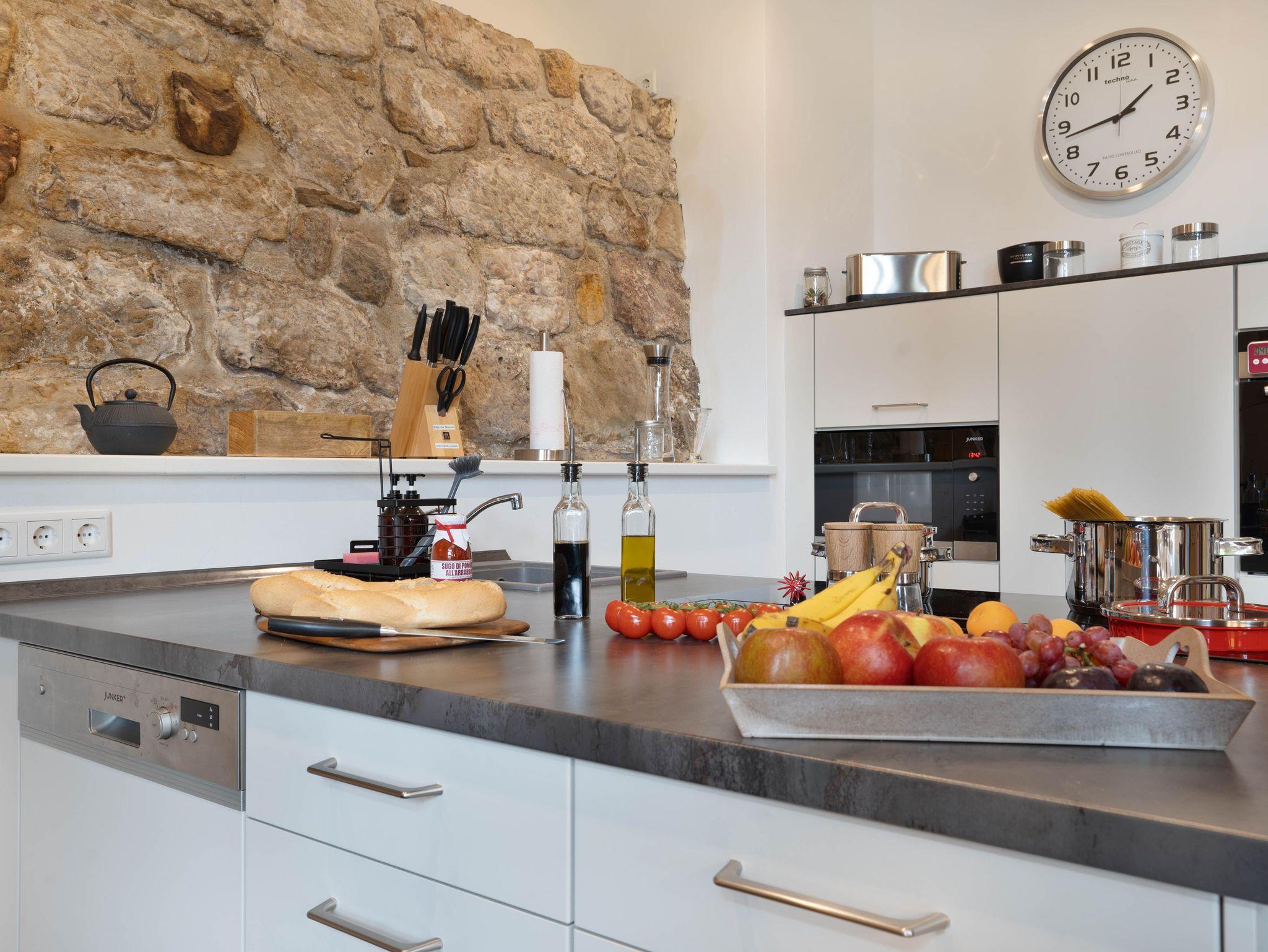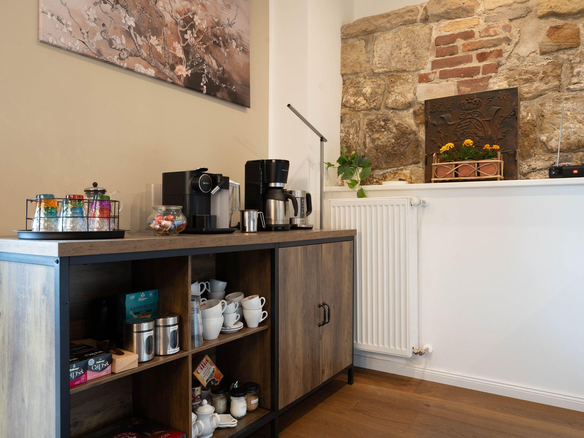 Die Küche selbst ist modern, hochwertig und mit allem ausgestattet, was man für einen angenehmen Urlaubsaufenthalt benötigt. In der Kücheninsel befindet sich eine Induktionskochplatte mit integrierter Dunstabzugshaube, ebenso die Spüle und die Spülmaschine. Unsere Töpfe und Kochutensilien sind hochwertig. Wir stellen Ihnen eine große Auswahl an Gläsern und Geschirr zur Verfügung. Ebenso finden Sie bei uns Salz und Pfeffer aus der Mühle, Essig, Raps- und Olivenöl, diverse Gewürze, Zucker, Honig und Mehl vor. Eine Kaffee- und Teebar rundet das große Angebot ab. Hier befinden sich ein Wasserkocher mit wählbarer Temperatur, ein Wasserfilter für den besseren Geschmack, eine Filterkaffeemaschine mit Filtertüten und Kaffeepulver (auch entcoffeiniert), Kakaopulver sowie eine Nespresso Gran Latissima Kapselmaschine mit Milchaufschäumer, so dass Sie sich Ihren Kaffee, Espresso, Cappuccino oder Latte macchiato frisch zubereiten können. Die entsprechenden Gläser und Tassen sind natürlich ebenfalls vorhanden. Verschiedene Kaffeespezialitäten und eine große Teeauswahl stehen für Sie bereit.