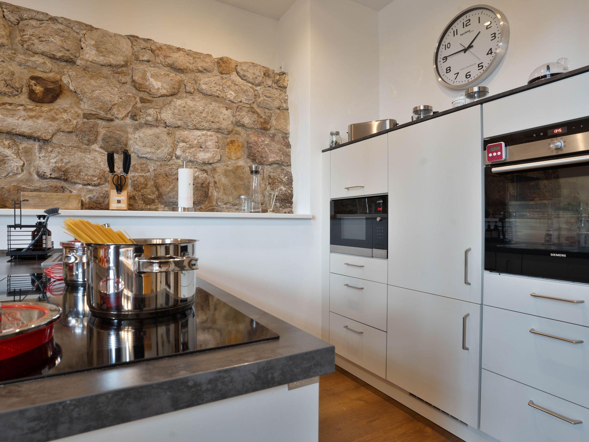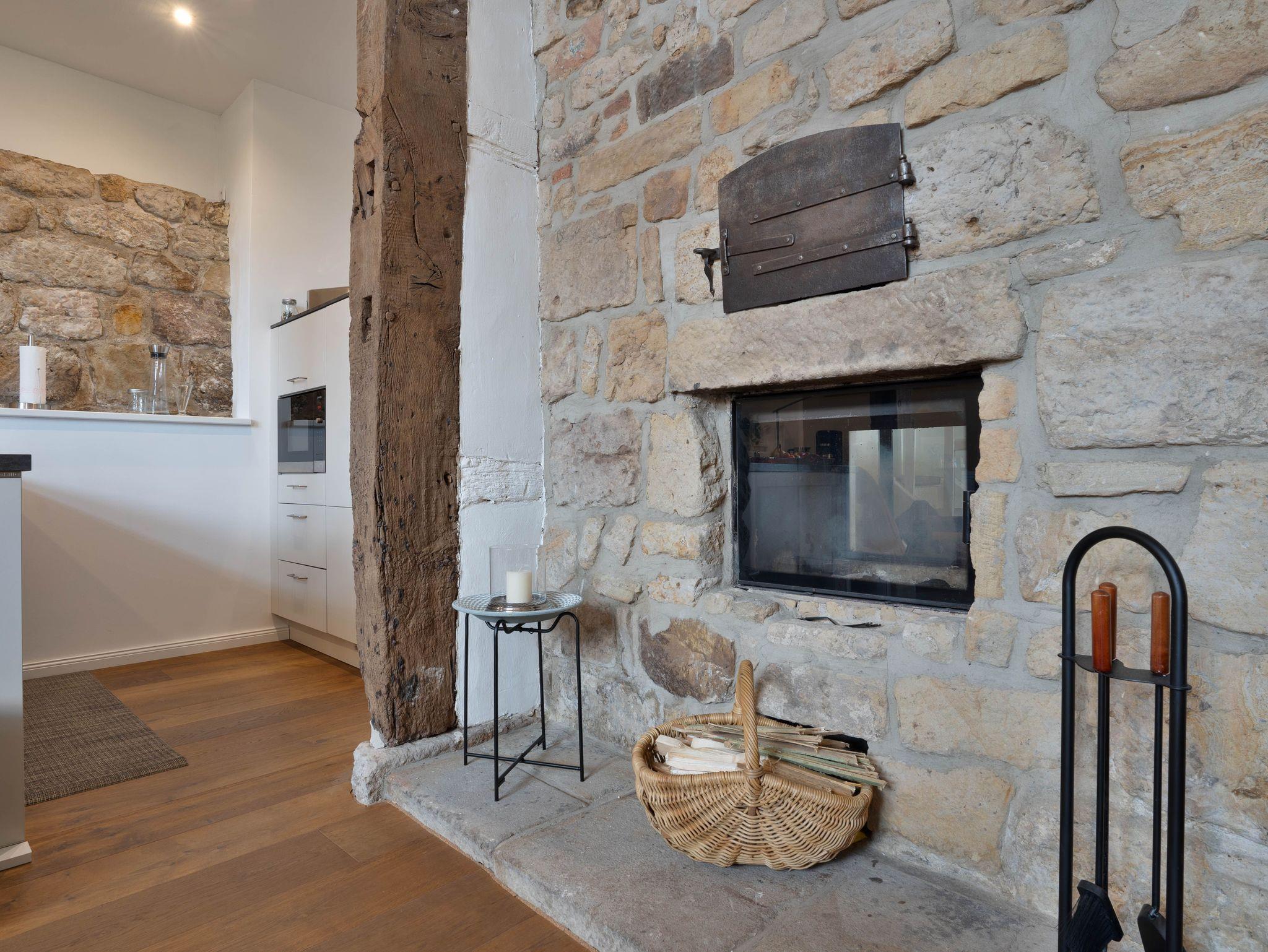 Kommen wir nun zur Wohnküche, die mit Echtholzboden ausgelegt ist und in der sich auch der tolle alte Kamin befindet. In den kalten Monaten sorgt er für eine behagliche Wärme und ein gemütliches Ambiente. Selbstverständlich stellen wir Ihnen das Holz während Ihres Aufenthalts kostenlos zur Verfügung.
