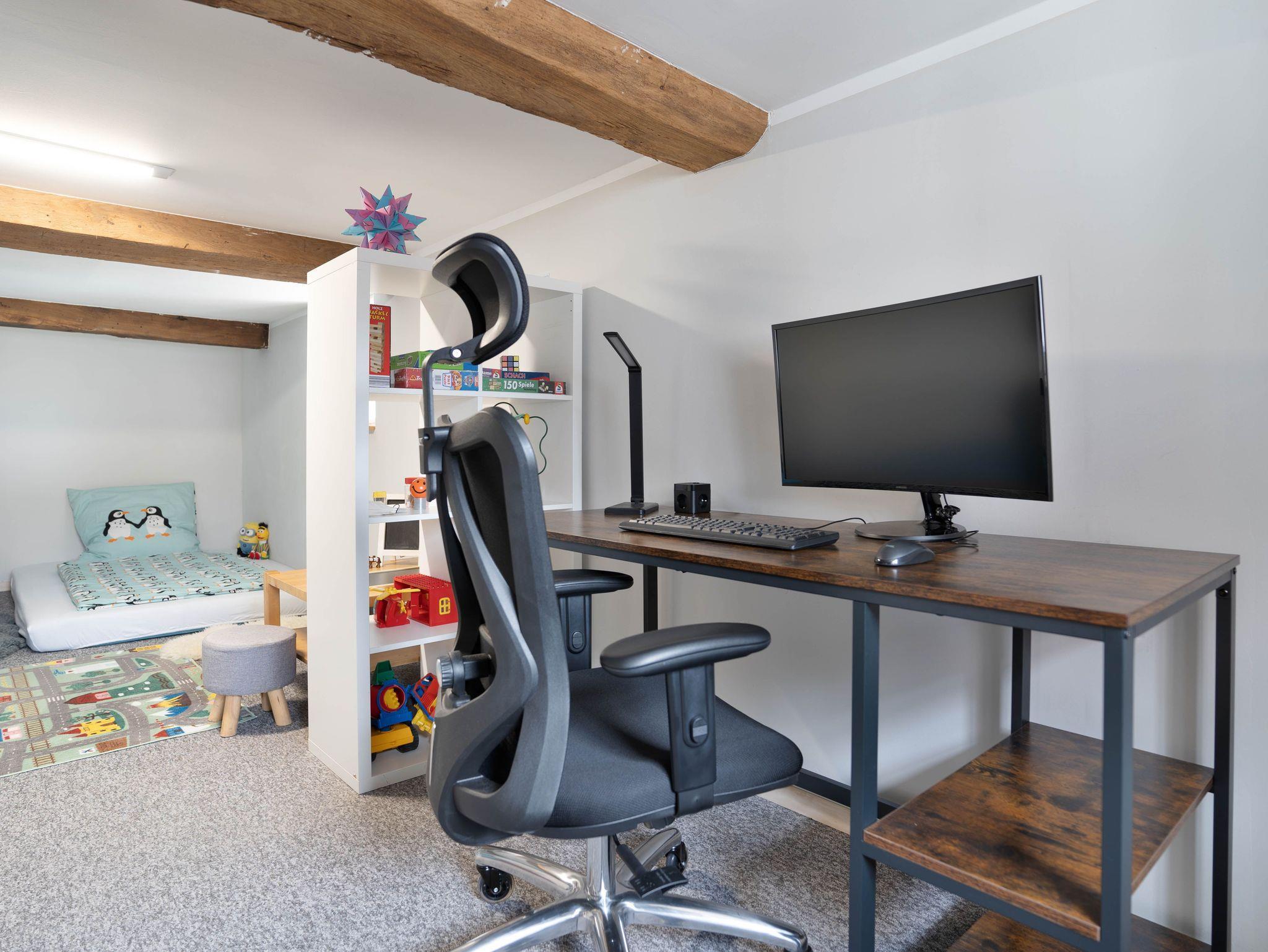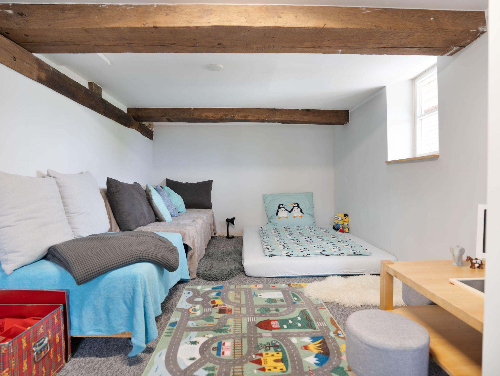 Über eine Raumspartreppe gelangt man zum Kinderzimmer, das ebenfalls mit einem Teppichboden ausgelegt ist und mit einer Tobeecke und diversen Spielen, Büchern und Malutensilien ausgestattet ist. Die Tobematratze hat eine Größe von 140x200 cm und kann ebenfalls als Schlafgelegenheit für den Nachwuchs genutzt werden. Ein kleines Schlafsofa sowie ein weiterer Schreibtisch für Workation befinden sich ebenfalls in dem 18qm großen Raum.