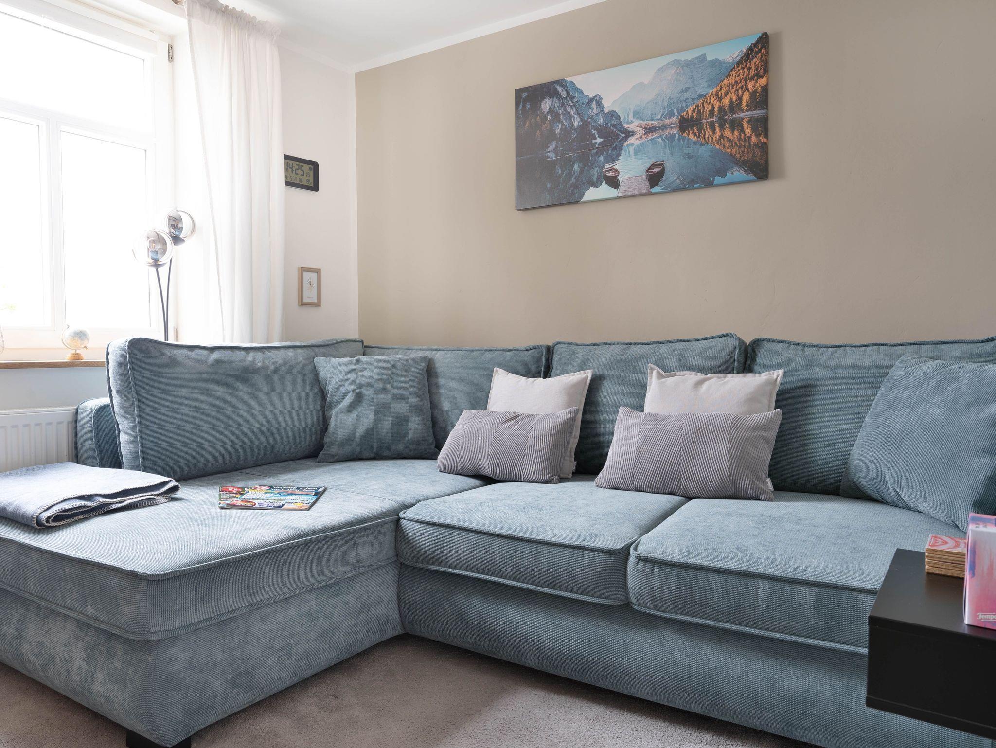Angrenzend an den Essbereich gelangen Sie in das kleine aber feine Wohnzimmer mit Teppichboden. Dort befinden sich ein gemütliches Sofa mit Decken und Kissen sowie ein moderner 50-Zoll 4k- Fernseher mit Netflix, RTL+ und Magenta TV sowie Airplay- und Chromecastfunktion und ein HDMI-Kabel. Über die Grundig Kompaktanlage mit Internet- und DAB+Radio sowie Bluetooth-Funktion können Sie Ihre Spotify-Playlist mit einem guten Sound abspielen. Das Sofa kann mit dem vorhandenen Topper zu einem Bett mit einer Liegefläche von 140x200 cm umgebaut werden.