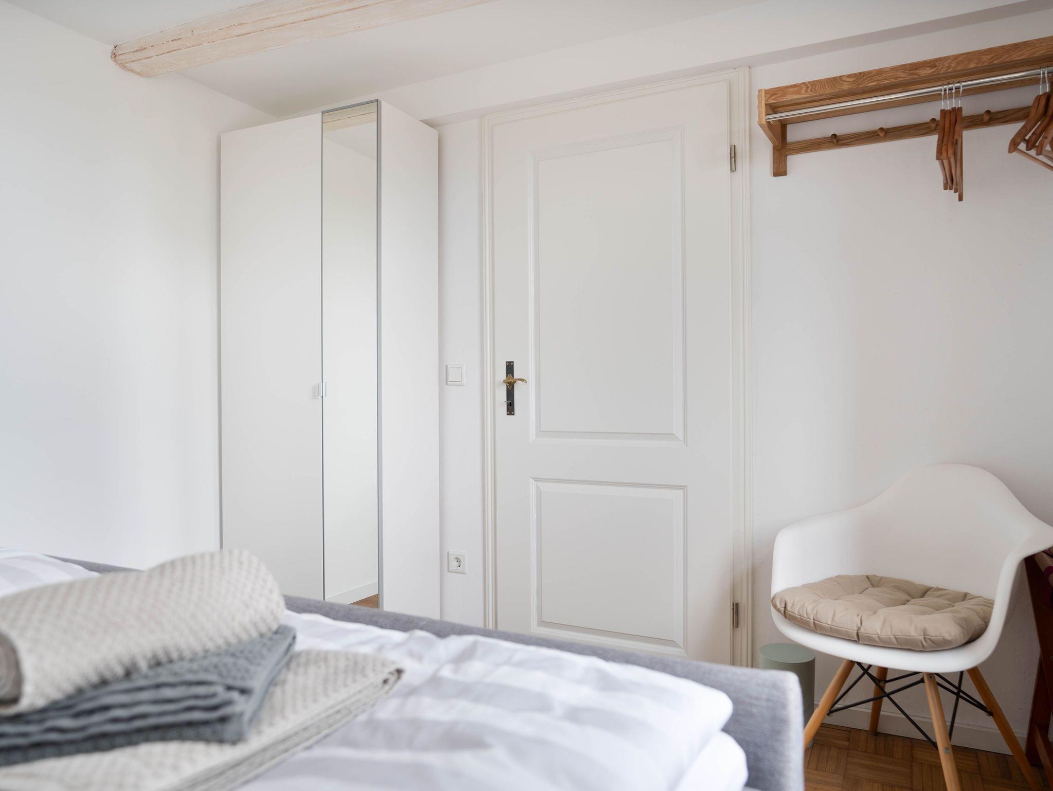Alle Zimmer sind hochwertig ausgestattet. Es gibt zwei Schlafzimmer mit modernen Boxspringbetten 180x200 cm. Die Bettwaren sind allergikerfreundlich und für ein luxuriöses Hautgefühl mit Damastbettwäsche aus reiner Baumwolle bezogen. Jeder Gast erhält 3 Kissen und einen Nachttisch mit moderner Lampe, an der Sie Ihr Handy über ein USB-Kabel direkt am Bett laden können. Außerdem stellen wir Ihnen in jedem Schlafzimmer einen modernen Radiowecker und eine Taschentücherbox zur Verfügung. In jedem befindet sich ein Schrank und ein Ganzkörperspiegel sowie ein Abfalleimer. Im größeren der beiden Zimmer befindet sich zusätzlich ein Schreibtisch (für Workation auch komplett ausgestattet), und es gibt dort Platz für ein Kinderreisebett, das wir Ihnen bei Bedarf kostenlos zur Verfügung stellen. Eine Kitchenette mit eigenem Kühlschrank und Spüle sowie einem Wasserkocher und einer kleinen Nespresso-Kapselmaschine ist ebenfalls Teil des Raums. Außerdem finden Sie dort entsprechende Tassen und eine kleine Auswahl an Kaffeekapseln und Teebeuteln. Das kleine Duschbad mit Handtuchheizkörper liegt en suite und gehört Ihnen ganz alleine. Auch hier stehen kostenlose Reinigungs- und Pflegemittel sowie ein Föhn zur Verfügung. Eine Außentür führt Sie nach draußen zu Ihrer eigenen kleinen Terrasse mit Sitzgelegenheit.