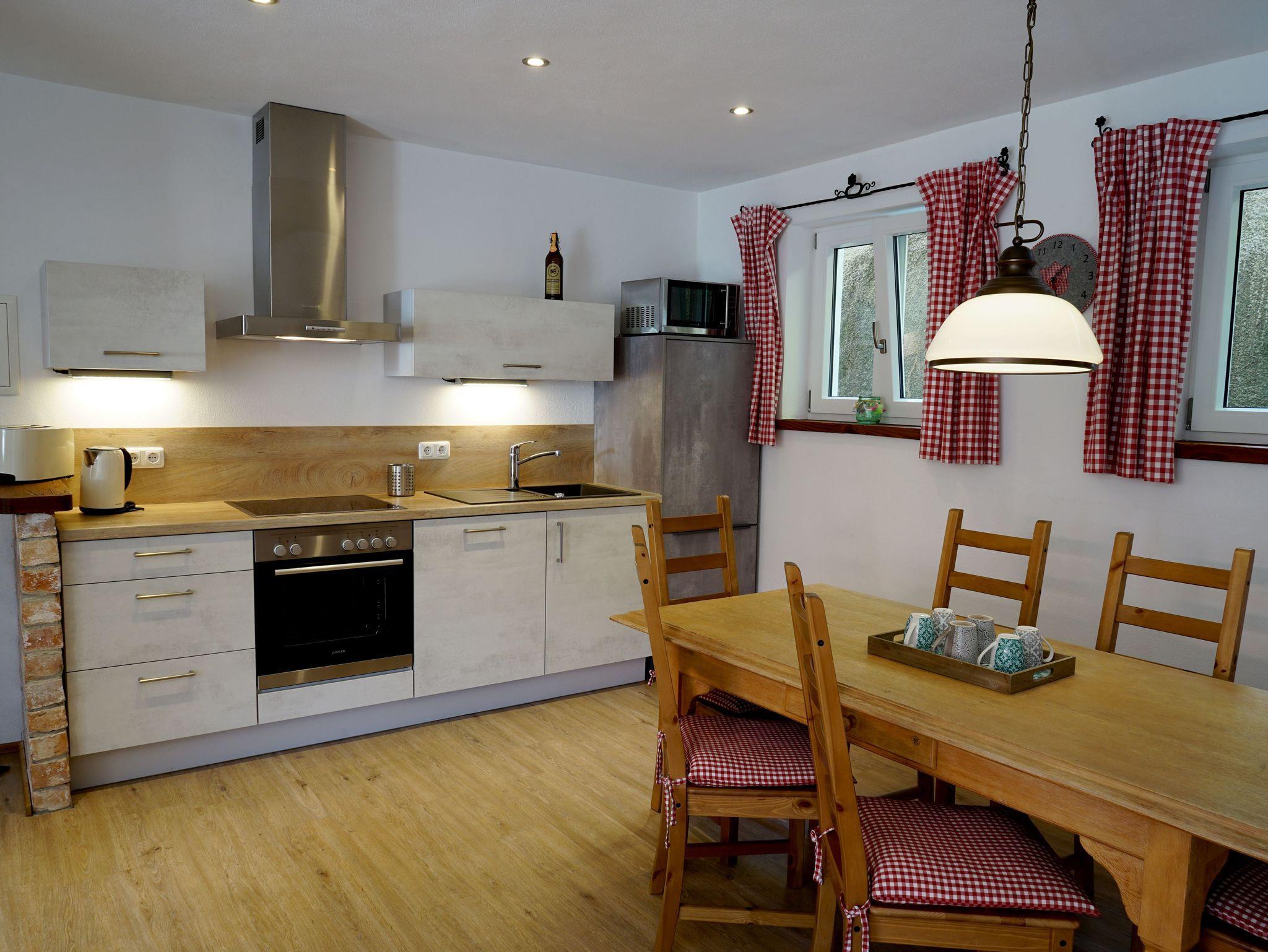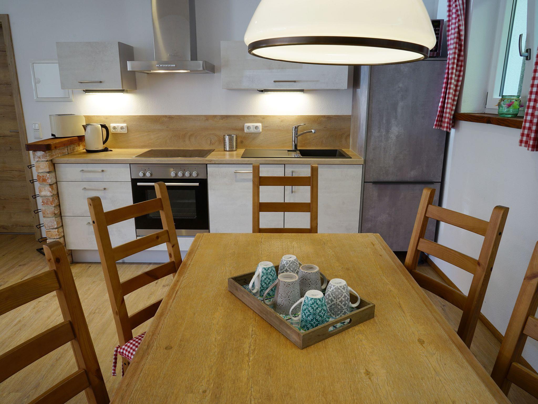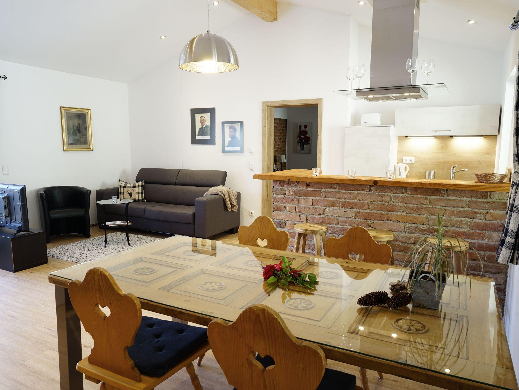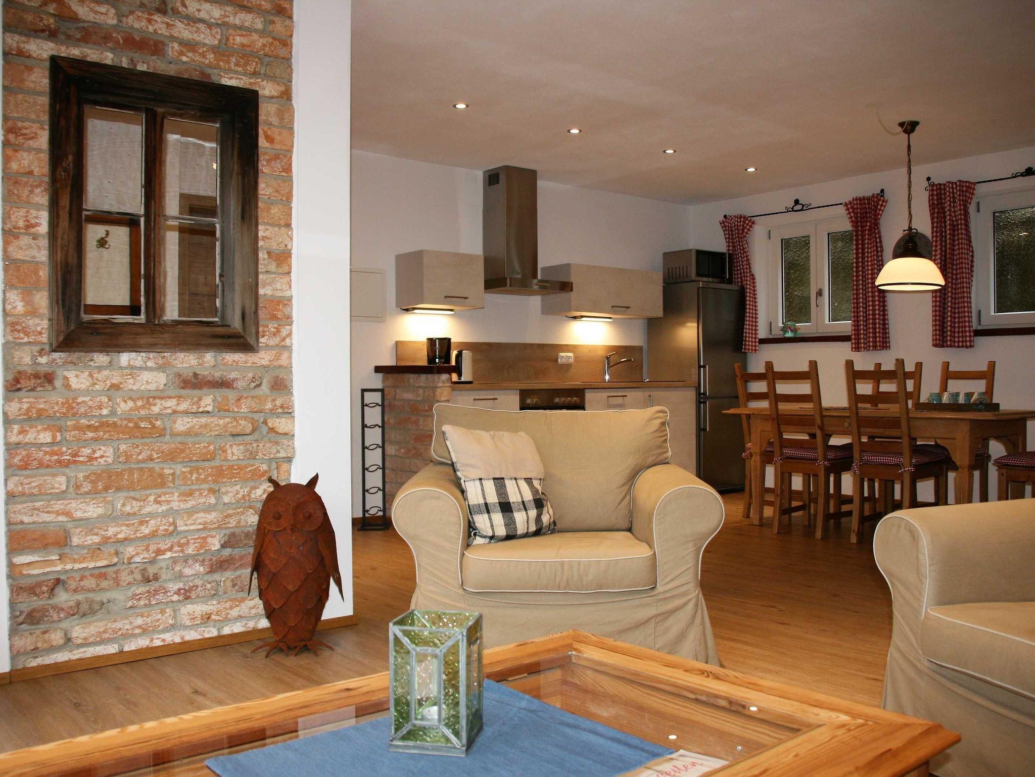 Große Ferienwohnung (70qm) mit 2 Schlafzimmer und separatem Eß- und Wohnbereich. Die Wohnung liegt im Erdgeschoß, hat einen eigenen Eingang, ist komplett barrierefrei und eignet sich u.a. bestens für Familien. Die Küche ist voll ausgestattet und verfügt über eine Spülmaschine. Direkt vor dem großen Fensterelement befindet sich eine schöne und geschützte Terrasse.