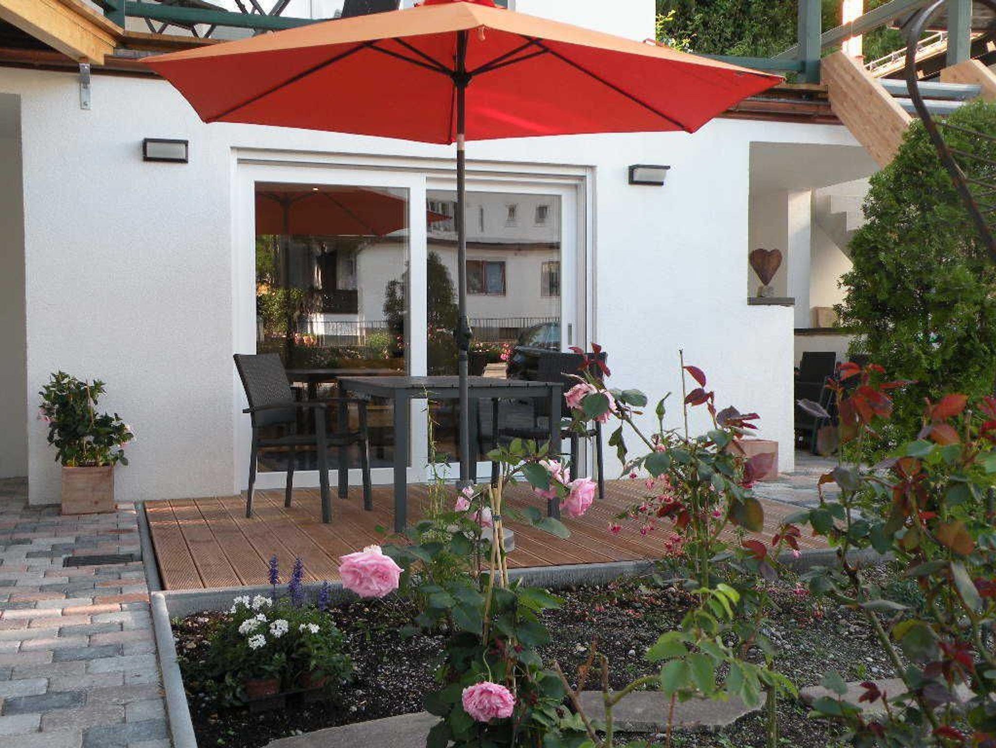 NEU! Wunderschöner ruhiger Gastgarten mit tollem Blick auf Berge und See über den Dächern von Tegernsee. Neu gestaltet mit hochwertigen Holzterrassen und Gartenmöbeln.