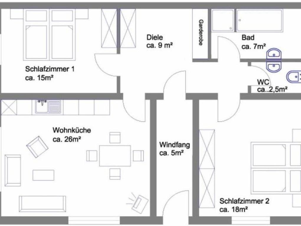 Unsere Ferienwohnung hat einen separaten Eingang mit einer Größe von 80 m2. Sie ist ausgestattet mit einer großräumigen komplett eingerichteter Wohnküche mit Nespresso-Kapselmaschine, Toaster, Kühlschrank mit extra Gefrierschrank, Wasserkocher, Spülmaschine und Mikrowelle. Tisch- und Küchenwäsche ist vorhanden. Wohnzimmer ist mit Kabel TV und einem Radio ausgestattet. Die zwei Schlafzimmer sind mit je zwei Doppelbetten ausgestattet. Auf Wunsch kann ein Kinderbett aufgestellt werden. In unserem Bad / Dusche (WC separat) befindet sich u.a. auch eine Waschmaschine, Wanne und Dusche, Fön und Kosmetikspiegel.Nespresso-Kapselmaschine, Toaster, Kühlschrank und separater Gefrierschrank, Wasserkocher, Spülmaschine, Mikrowelle, Tisch-, Küchen- und Bettwäsche sowie Handtücher sind vorhanden.